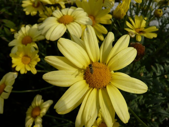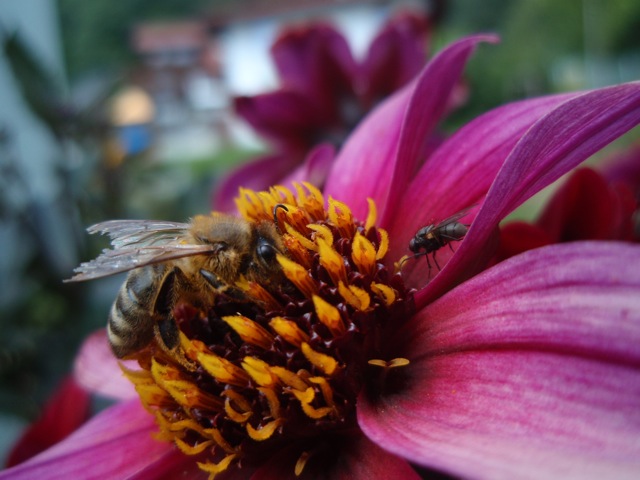 Fliege und Honigbiene treffen an der Blüte einer ungefüllten Dahlie auf einander. glg robi ma1.jpg (79.12 KB) ma1.jpg