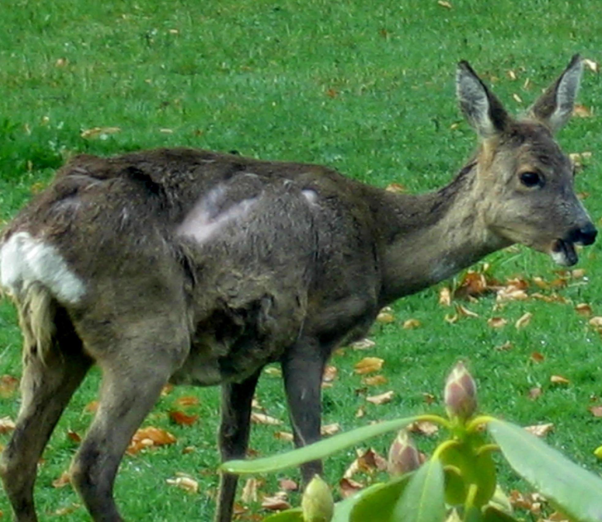 Ich zieh die Vorhänge auf nach dem Aufstehen und erblicke die seit zwei Tagen vermisste trächtige Ricke