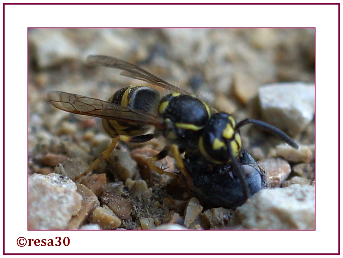 Eine Wespe beim Kampf mit ihrer Beute - eine tote Schwebfliege. Erst hat sie sie als Ganzes versucht abzutransportieren, das ging aber nicht auf dem Kies, trotz allem Ziehen und Zerren... Dann hat sie sie halbiert (fein säuberlich durchgebissen), das Foto zeigt sie mit der Hälfte. Der Transport gestaltete sich aber weiterhin mühsam...