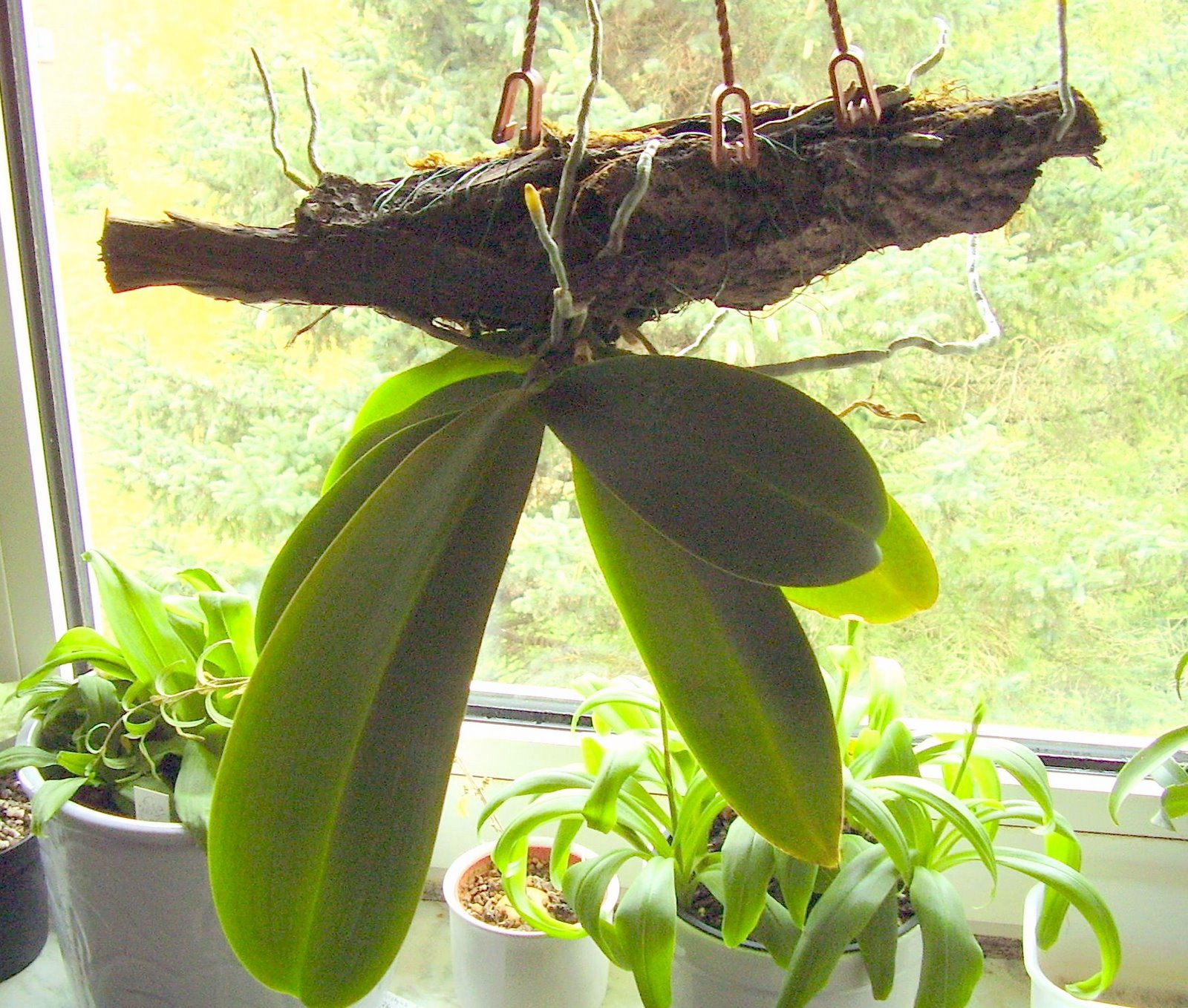 Phalaenopsis sind zwar nicht die Orchideen meiner Wahl, aber als Versuch habe ich mal eine vom Baumarkt-Grabbeltisch mitgenommen und sie als "Sandwich" aufgebunden. So hängt sie jetzt schon im zweiten Jahr bei mir am West-Fenster und das Blatt, das sie dieses Jahr geschoben hat ist größer als das aus dem Eingewöhnungs-Jahr. Sie wird manchmal mit der Badewannen-Brause gegossen und einmal die Woche für eine Stunde im Waschbecken in Wasser getaucht, diesem wird ein kleiner Schuss Blumendünger zugesetzt. Wie ihr seht, kein besonderer Aufwand.