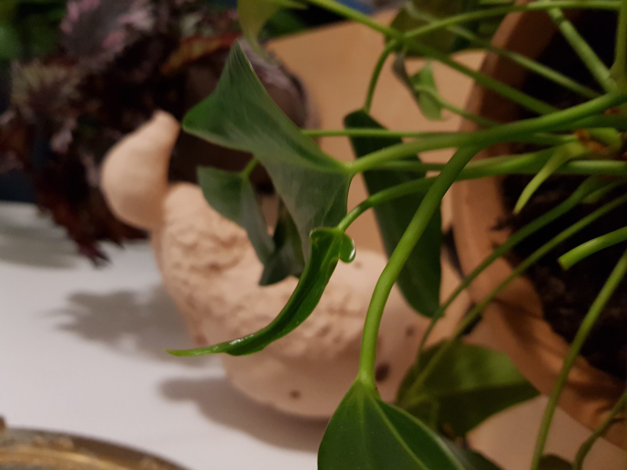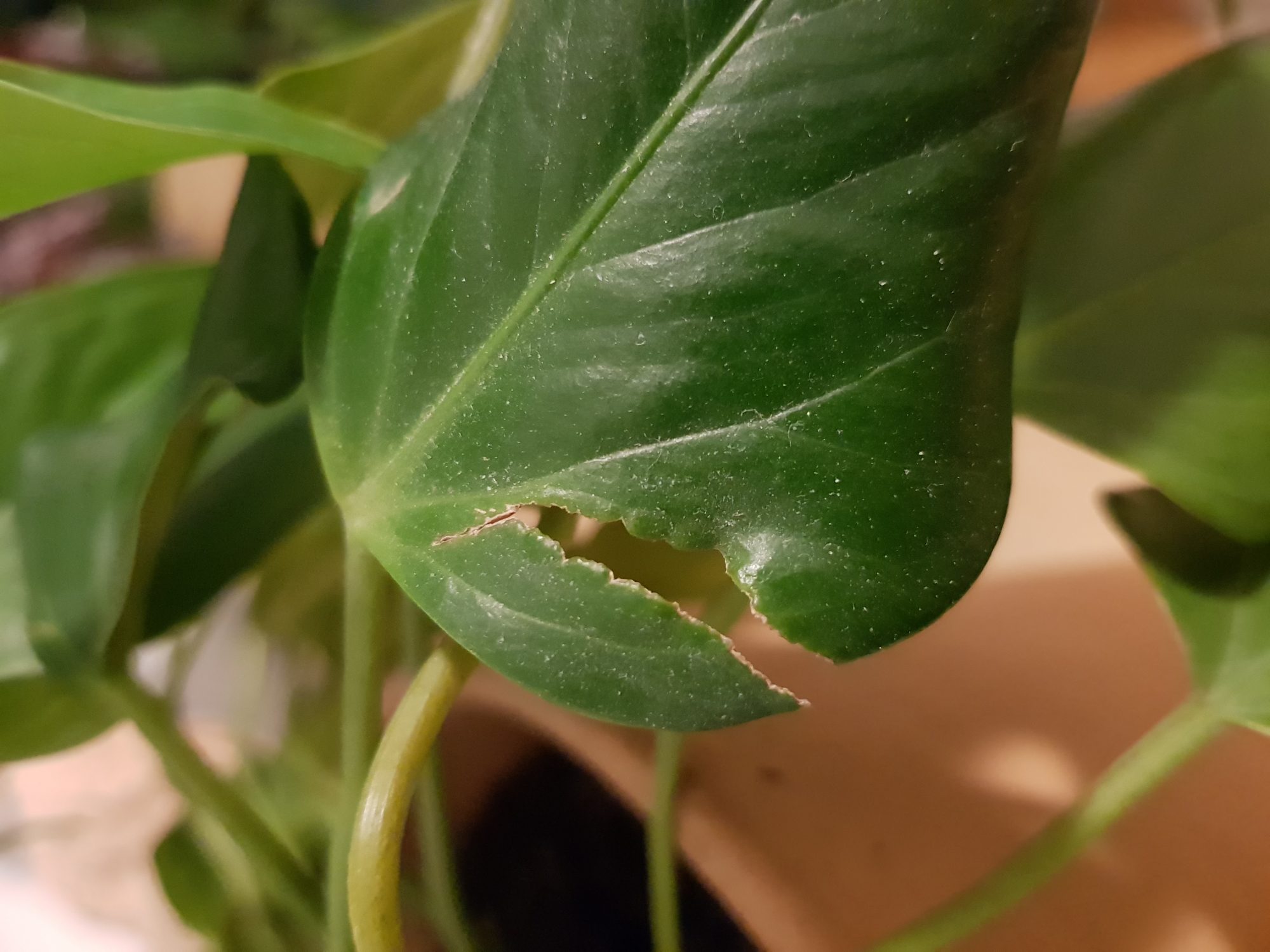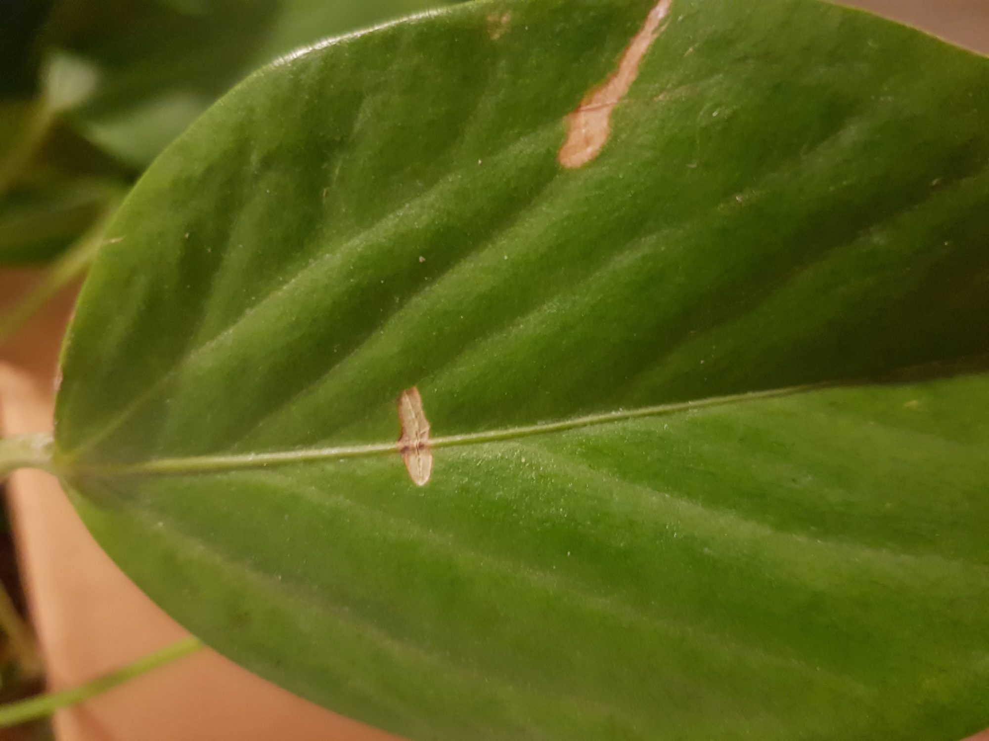 Mein Einblatt hat seit eingen Tagen braune, längliche Einkerbungen, die dann aufreißen und aussehen wie angeknabbert.