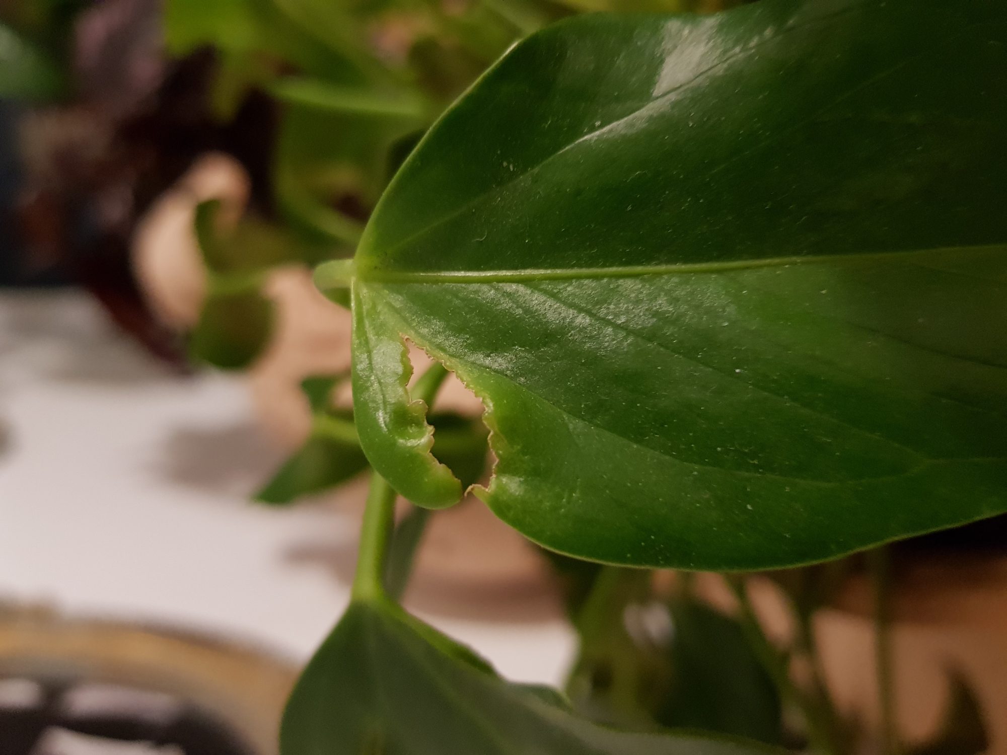 Mein Einblatt hat seit eingen Tagen braune, längliche Einkerbungen, die dann aufreißen und aussehen wie angeknabbert.