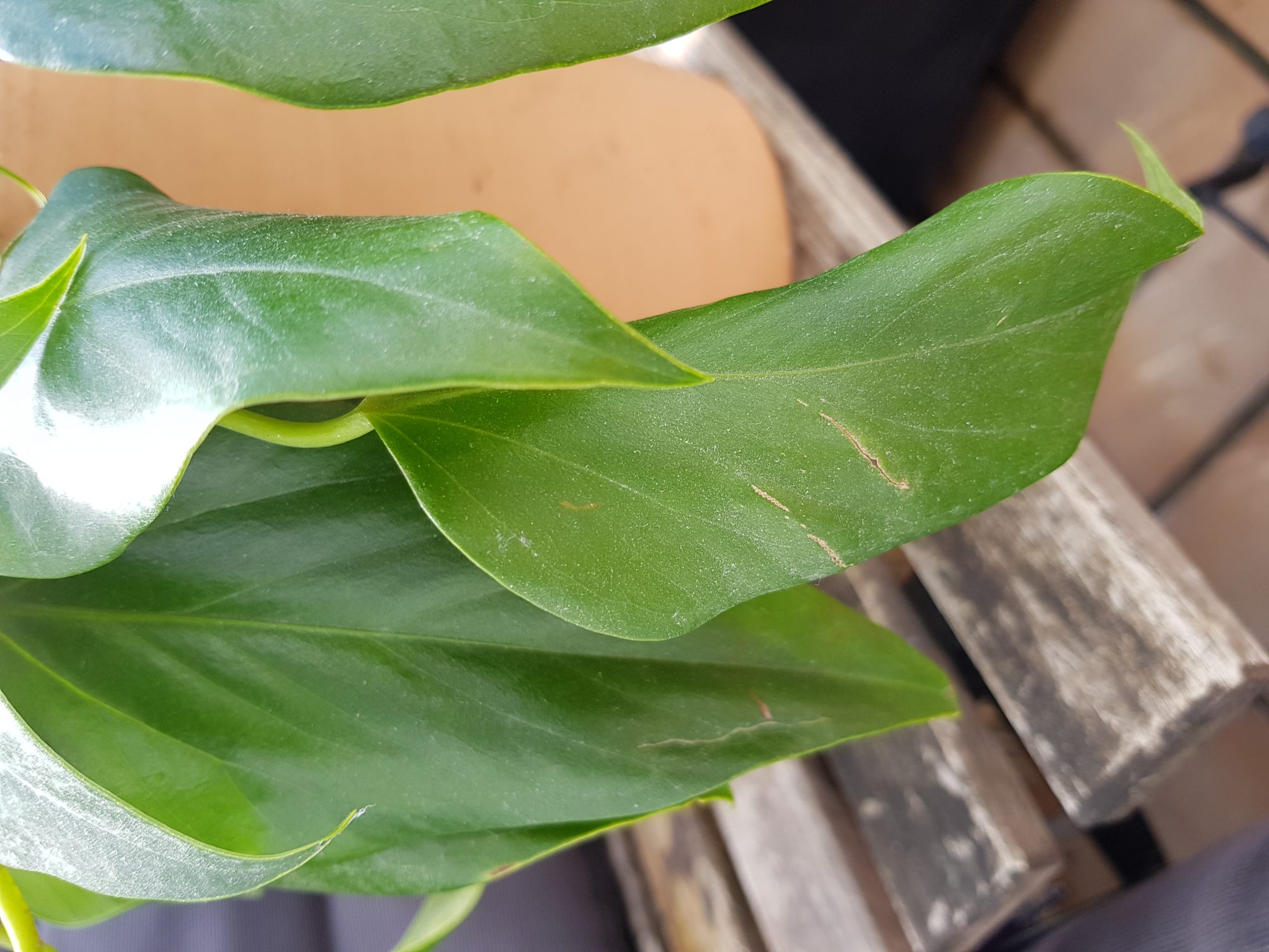 Mein Einblatt hat seit eingen Tagen braune, längliche Einkerbungen, die dann aufreißen und aussehen wie angeknabbert.