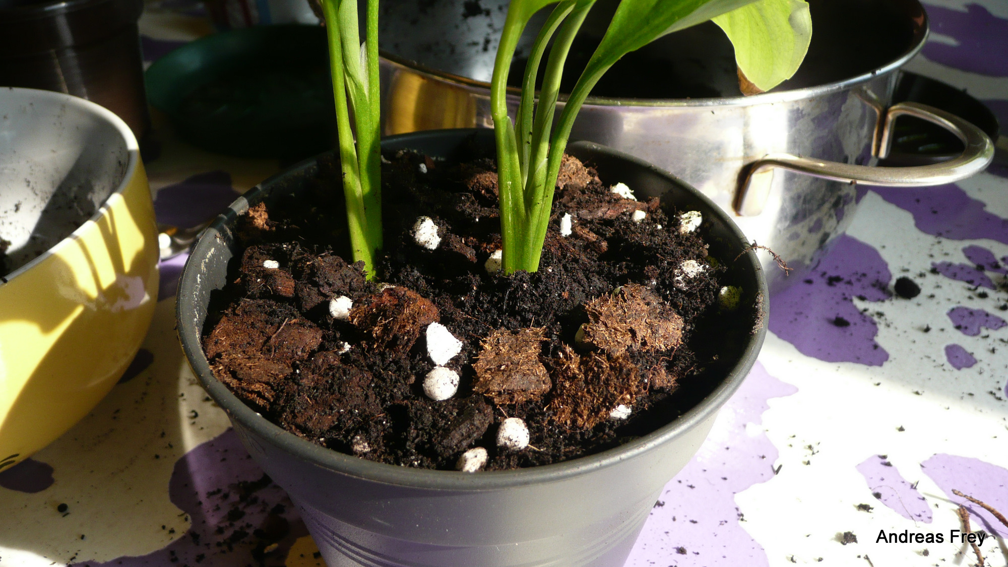 Vor einiger Zeit habe ich ein Einblatt umgetopft und dabei geteilt. Dabei habe ich drei Pflanzen gebildet eine die recht gut aussieht und auch Blüten schiebt. Und die zwei um die es hier geht sie waren einfach nicht so schöne Teile der Mutterpflanze und ich dachte das Umtopfen in eigene Pötte könnte ihnen wieder Auftrieb geben. Anfangs saßen sie alle in der gleichen Einheitserde. Doch haben sich die beiden Sorgenkinder nicht gebessert. Ok anfangs habe ich sie etwas zu feucht gehalten aber ich hab relativ schnell im Forum gelernt daß das nicht so gut ist für Einblätter. So und jetzt habe ich angefangen sie nochmal umzutopfen und mit der Erde rumzuexperimentieren weil das erste Umtopfen und separieren in eigene Pötte den schwächlichen beiden nichts gebracht hat.