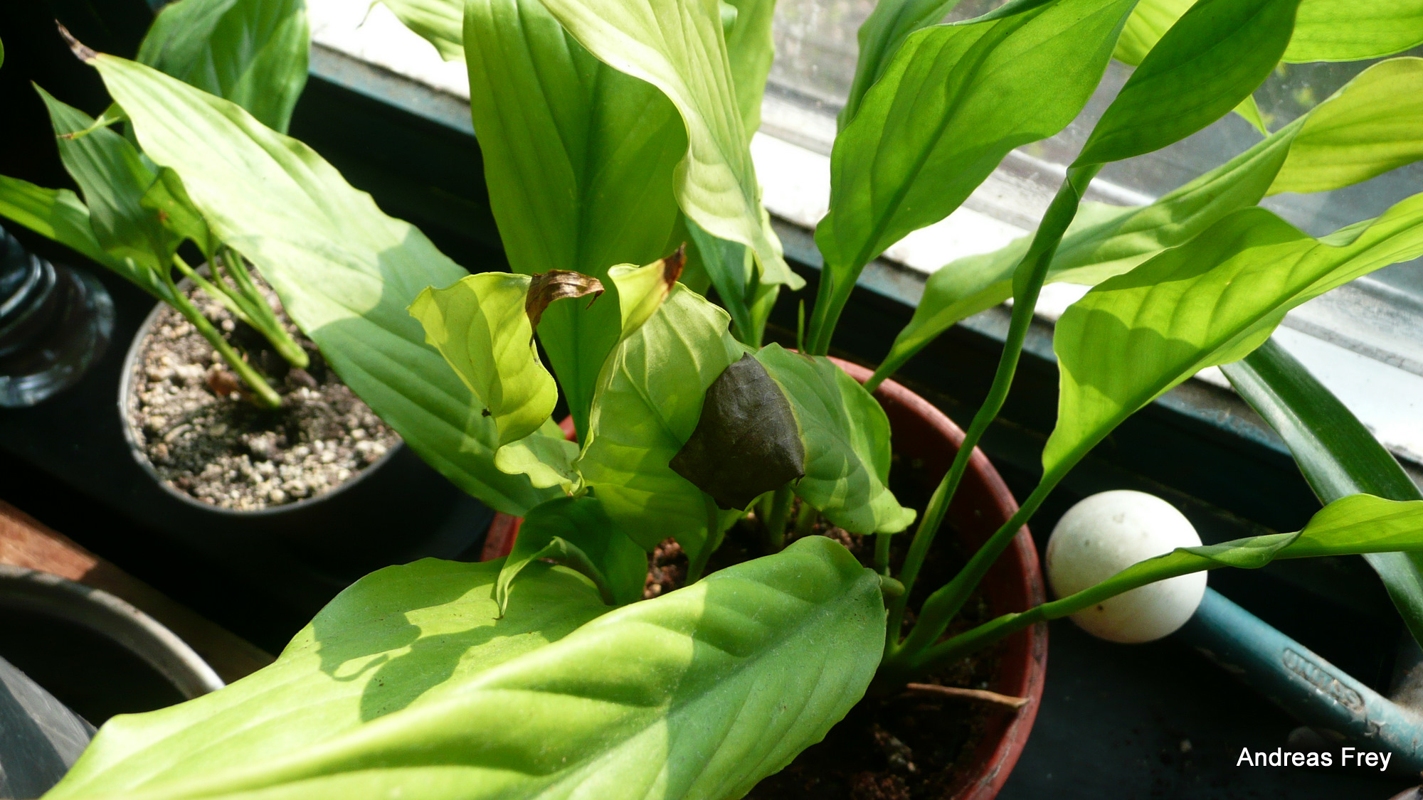 Bilder 3 und 4 zeigt die andere Pflanze die war immer schon so gelb. Wobei mir die braunen Spitzen erst in letzter zeit besonders aufgefallen sind. Sie sitzt in einem Gemisch Einheitserde 50:50 mit Kokohum. Die habe ich vor ca 2 Wochen dort reingesetzt, war anfangs ziemlich feucht und bis jetzt bauchte ich sie noch nicht giessen.