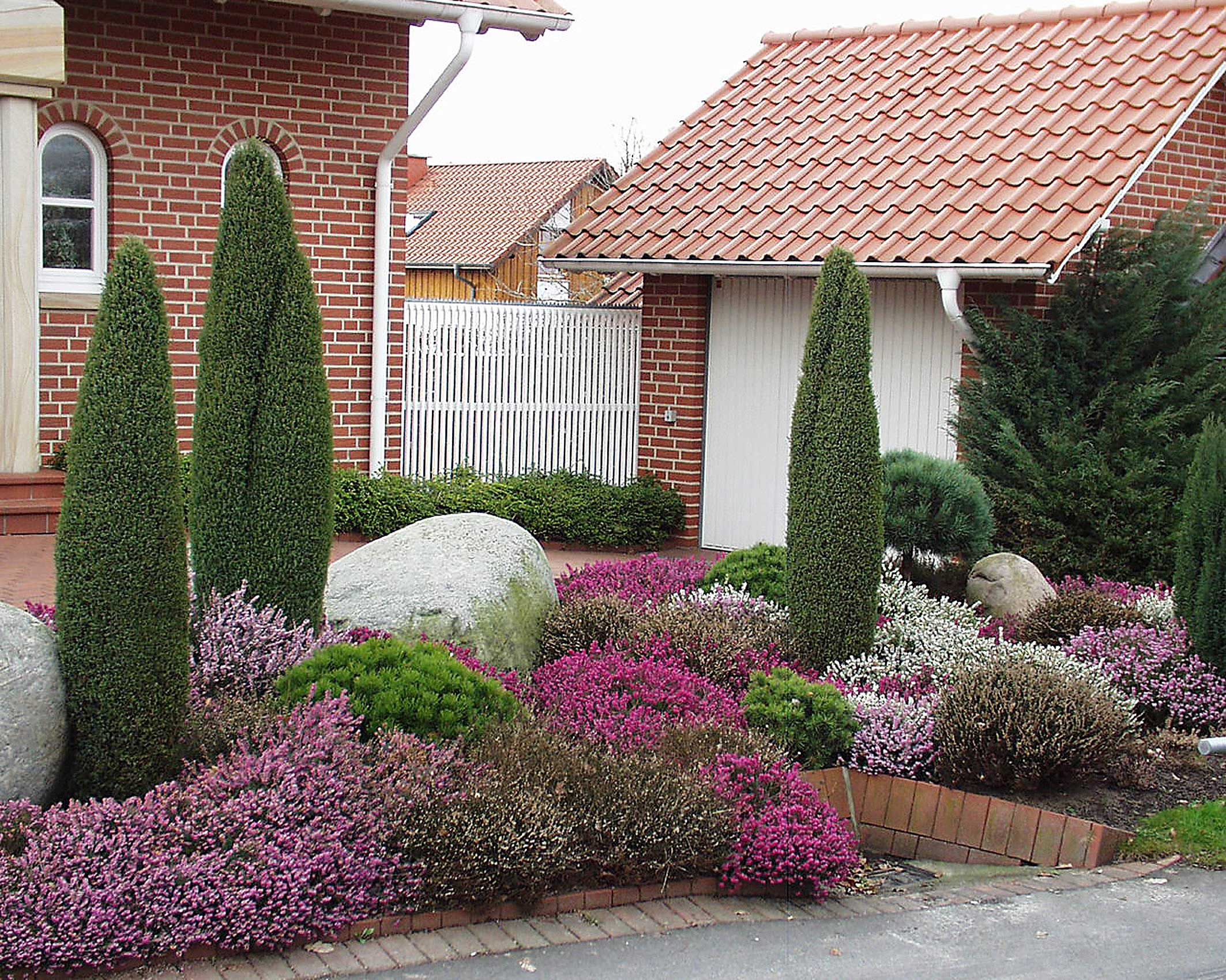 Beliebt ist in Heidegärten die Kombination der früh blühenden Besenheide mit der winterblühenden Schneeheide (Erica carnea), die abgesehen von sehr tiefen Frösten winterhart ist. Im Gegensatz zur Besenheide gedeiht sie auch auf typischem Gartenboden, wenn er genügend Humus enthält. Ihre Hauptblütezeit dauert von Dezember bis in den April, einige Knospen öffnen sich jedoch bereits im November. Sie ist mit weißen, roten und rosafarbenen Blüten erhältlich. Auch Erica gracilis, die Glockenheide, gehört seit jeher zum Repertoire eines Heidebeetes. Diese zierliche Heidepflanze leuchtet von Oktober bis in den Dezember hinein. Ihre Farbpalette reicht von reinem Weiß über verschiedene Rosatöne bis hin zu kräftigem Rot und Rot-Violett. Neben den Heidegarten-Klassikern wie Eriken und Callunen gibt es eine breite Auswahl an Begleitpflanzen. Strukturgebend wirken Gräser, wie zum Beispiel das Pfeifengras, oder verschiedene Gehölze, die auch in der natürlichen Heidelandschaft vorkommen, wie Birken, klein bleibende Kiefern, Säulenwacholder oder auch Ginster.