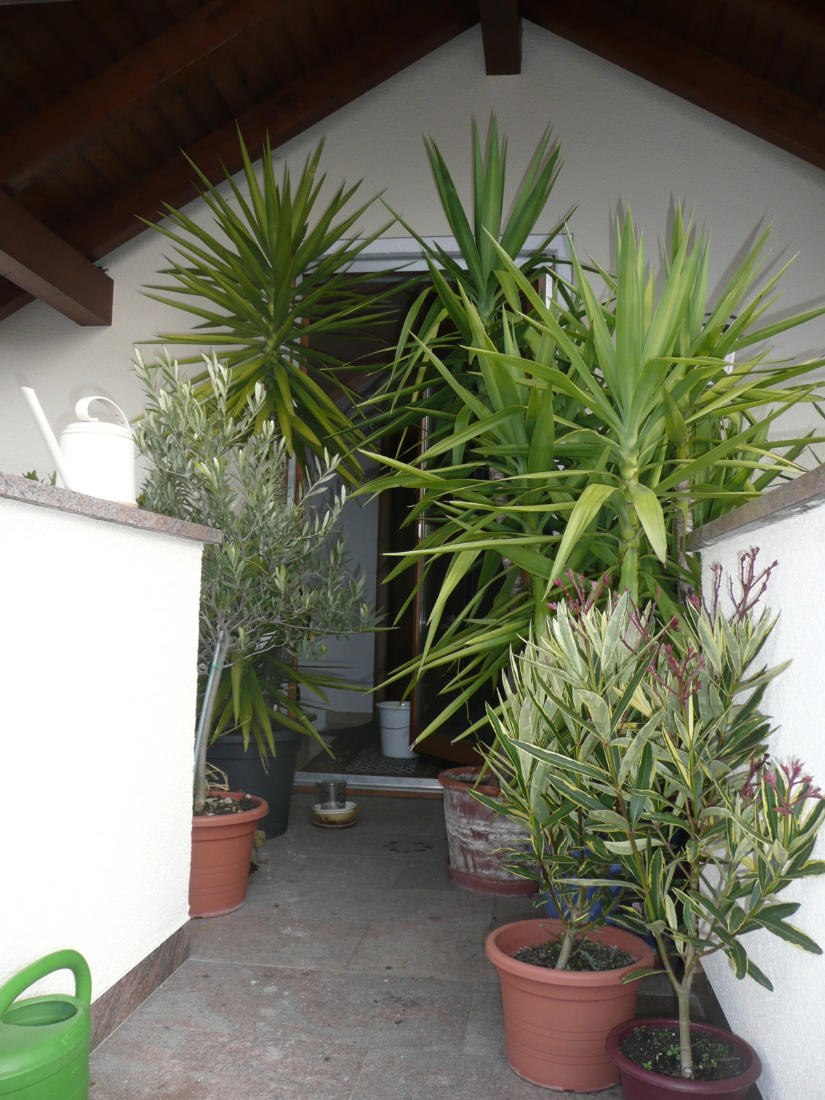 Oleander sind alle noch draußen. Die Yuccas stehen vor der Terrassentüre und warten auf Einlass