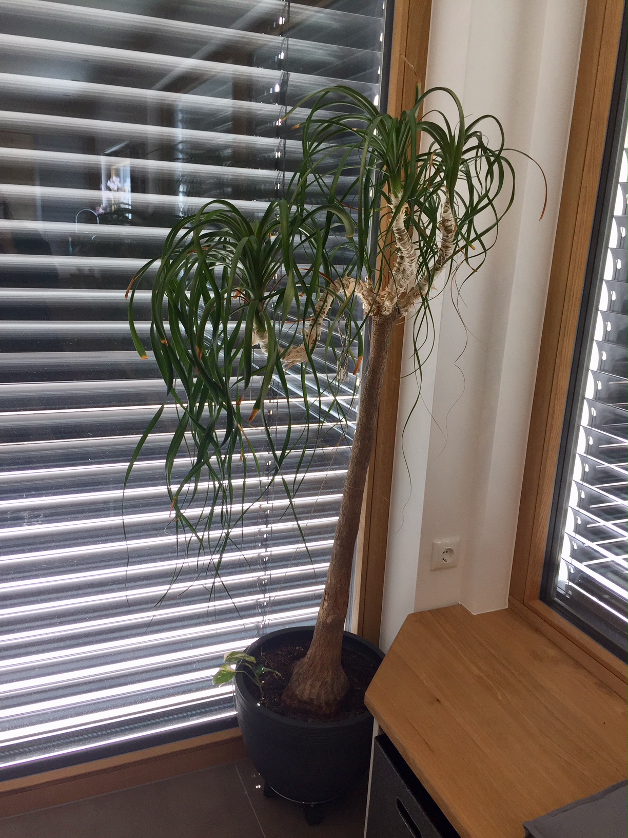 Ich gieße ihn nach Bedarf. Wenn ich sehe, dass die obere Erde sehr trocken ist, bekommt er einen großen Schuß Wasser. Gedüngt wird er selten, vielleicht 4-5mal im Jahr. In der Zeit, seit dem wir ihn haben, sind die Triebe schon gewachsen, allerdings das Absterben der anderen Blätter geht langsam aber stetig schneller.
