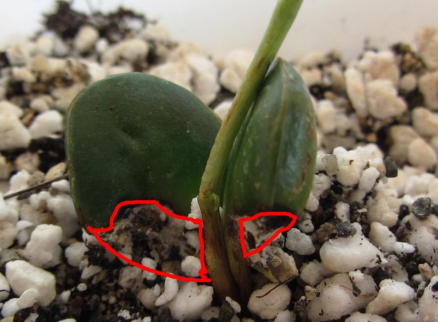 habe es mal eingezeichnet (hoch professionell mit zittriger maus in paint aber ich denke, man kann erkennen, was ich meine). die keimblätter (ja, die großen fleischigen) sind nicht mehr voll rund. das ist unten wie abgefressen, weggegammelt. die sind nicht hinter substrat versteckt, wo sie so plötzlich aufhören. sondern da ist einfach nichts mehr da.