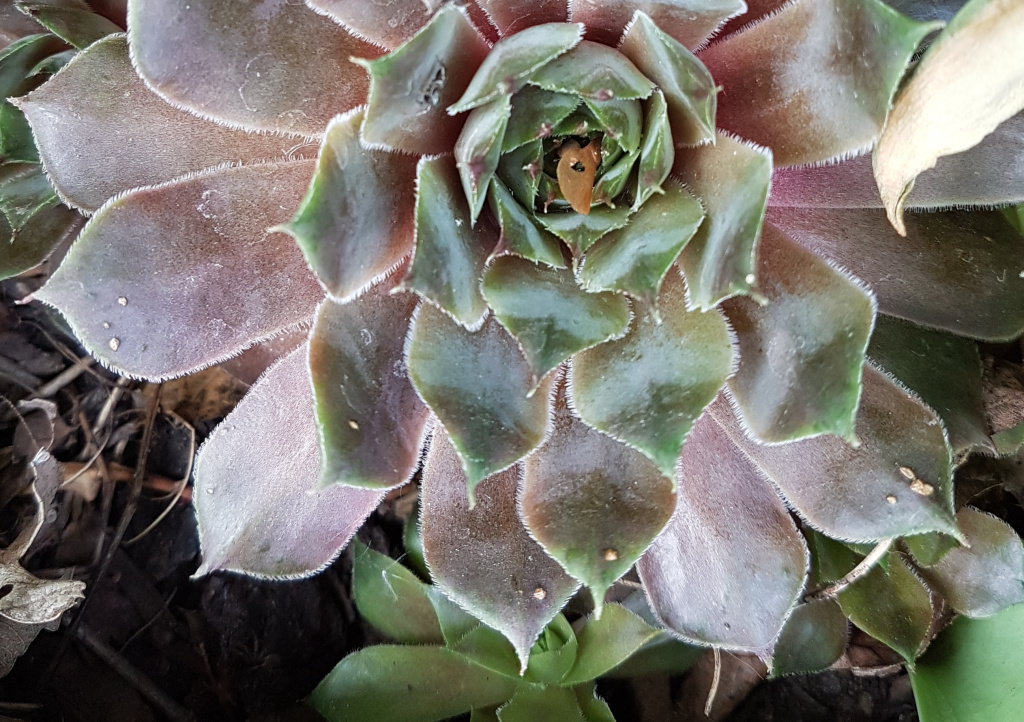 Nun sah ich mir auch mal andere Sempervivum-Pflanzen im Garten genauer an und ich bin mir nicht sicher, ob sich der Pilz verbreitet hat (die sitzen an ganz anderer Stelle). Die Rosetten sehen normal aus, sind nicht entfärbt usw, haben aber teils merdwürdige Flecken. An einer Pflanze ist auch eine Art Pustel.