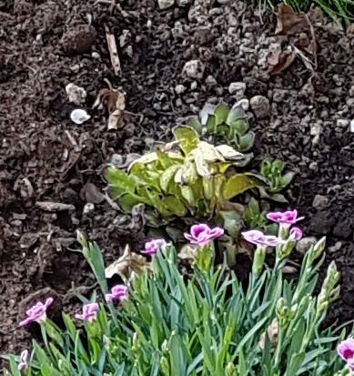 Hier sieht man es noch deutlicher, ein Bild vom 16.04.2019. Absolut gruselig. Als ich die Pflanze ausgegraben habe am 24.04., waren die Pusteln auf der Rückseite der Blätter rostrot. An der Stelle klafft derzeit ein größerer Krater, der fast bis zur Nachbarpflanze geht, da ich die Erde mit entfernt habe. Ich habe noch keine adäquate Ersatzpflanze gefunden (ein Sempervivum wird es nicht sein).