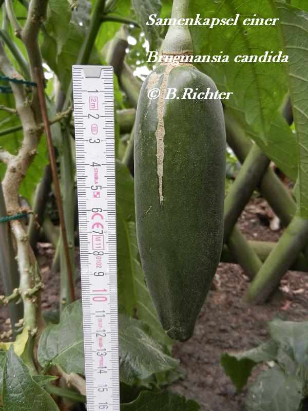 Samenkapseln von einer Brugmansia candida oder brugmansia Hybride werden dagegen dicker und ca. nur halb so lang.