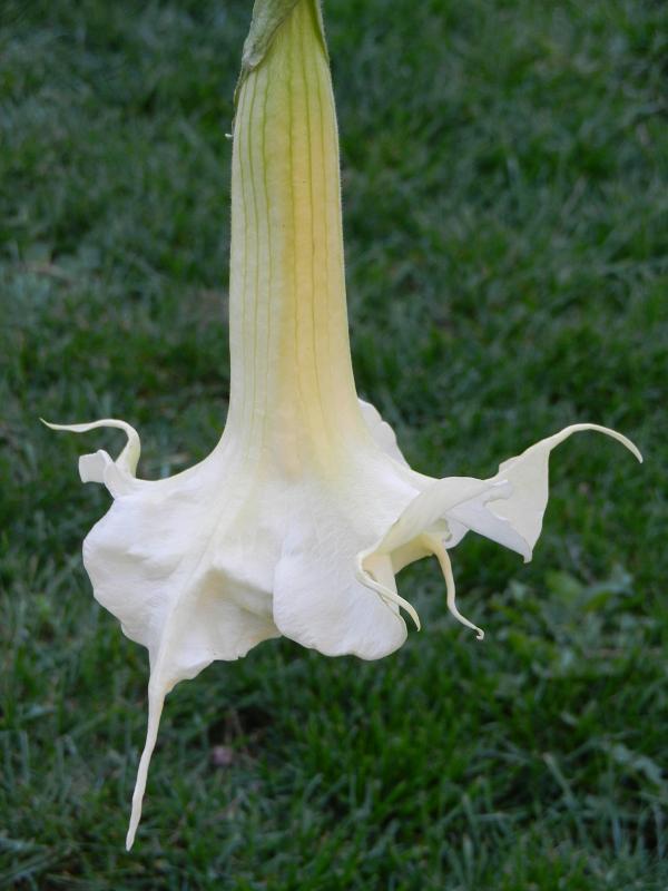 Und hier nun meine erste Blüte in diesem Jahr. Sie gehört zu der Brugmansia candida "Samba Dancer". Die Blüte ist cremeweiß und gefüllt: