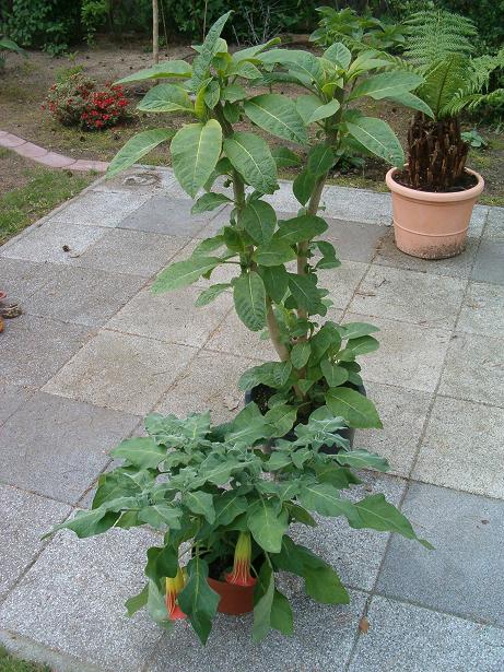 ich habe heute mal versucht ein Foto hinzubekommen, an dem man das unterschiedliche Wuchsverhalten von Brugmansia aurea x suaveolens Hybride und einer Brugmansia sanguinea Hybride sehen kann. Im Gegensatz zu anderen Brugmansia Sorten wachsen Die B. sanguinea nicht in die Höhe, sondern eher in die Breite; sie wirken "sparrig", gedrungen, klein.....