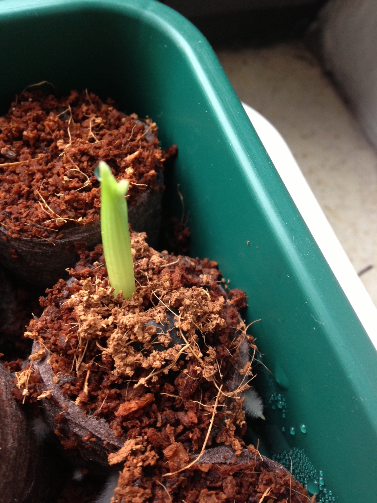 habe vor 2 Wochen ca. 60 Bananensamen in Kokosquell-Töpfchen eingesetzt und nun legt eine Pflanze ein sehr schnelles Tempo vor