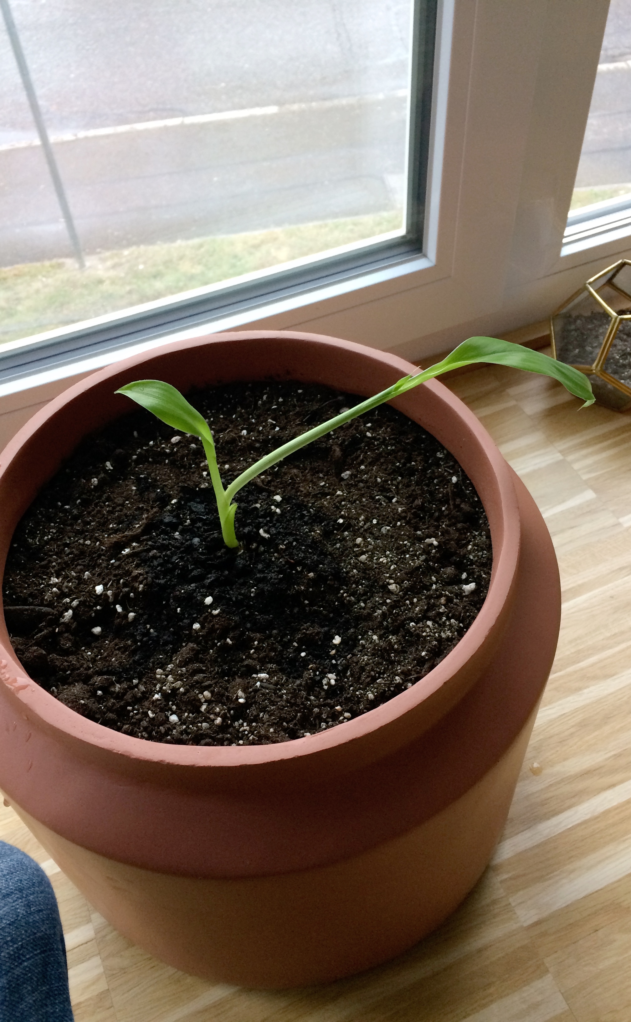 Der eine Keimling wuchs recht schnell, so dass er vor ca 1 Woche nicht mehr ins Gewächshaus passte. Ich habe ihn dann in einen Topf gesetzt und er wuchs schnell weiter. Ich schätze ca 1 cm/Tag.
