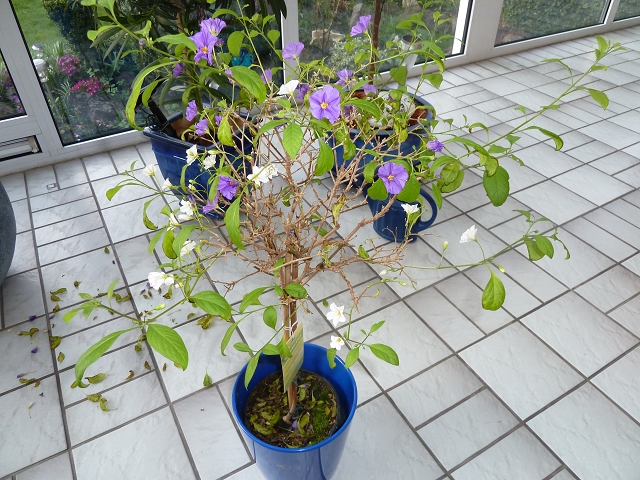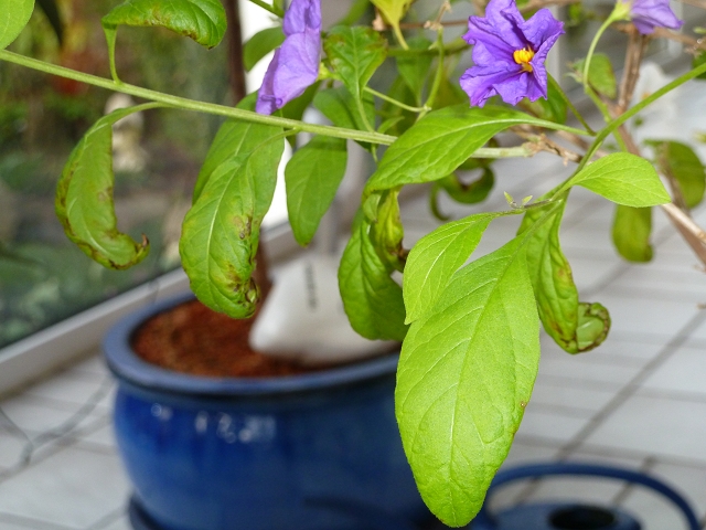 mein solanum ist plötzlich krank. ich habe ihn letztes jahr gekauft, er steht seit 03-2010 am selben platz im wintergarten, südseite, siehe fotos. im februar habe ich ihn gestutzt, er begann dann mit neuen trieben, blühte wieder weiß/lila.