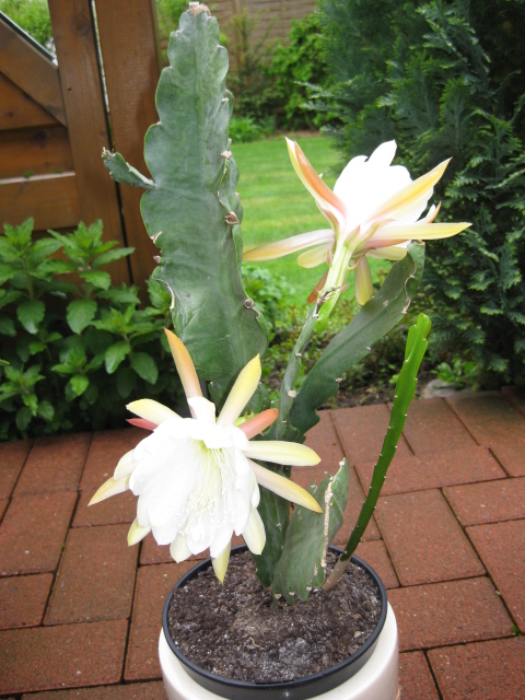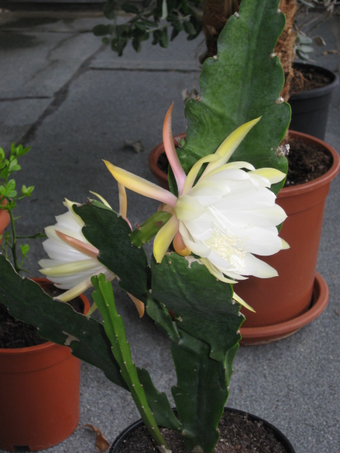 Ganz so klein ist der nicht.Hab den vor ca 5 jahren als steckling gestartet.Die "Blätter" sind so zwischen ca. 50 und 100 cm. Blüte hat ca 20 cm durchmesser , öffnet am Abend und duftet dann auch.