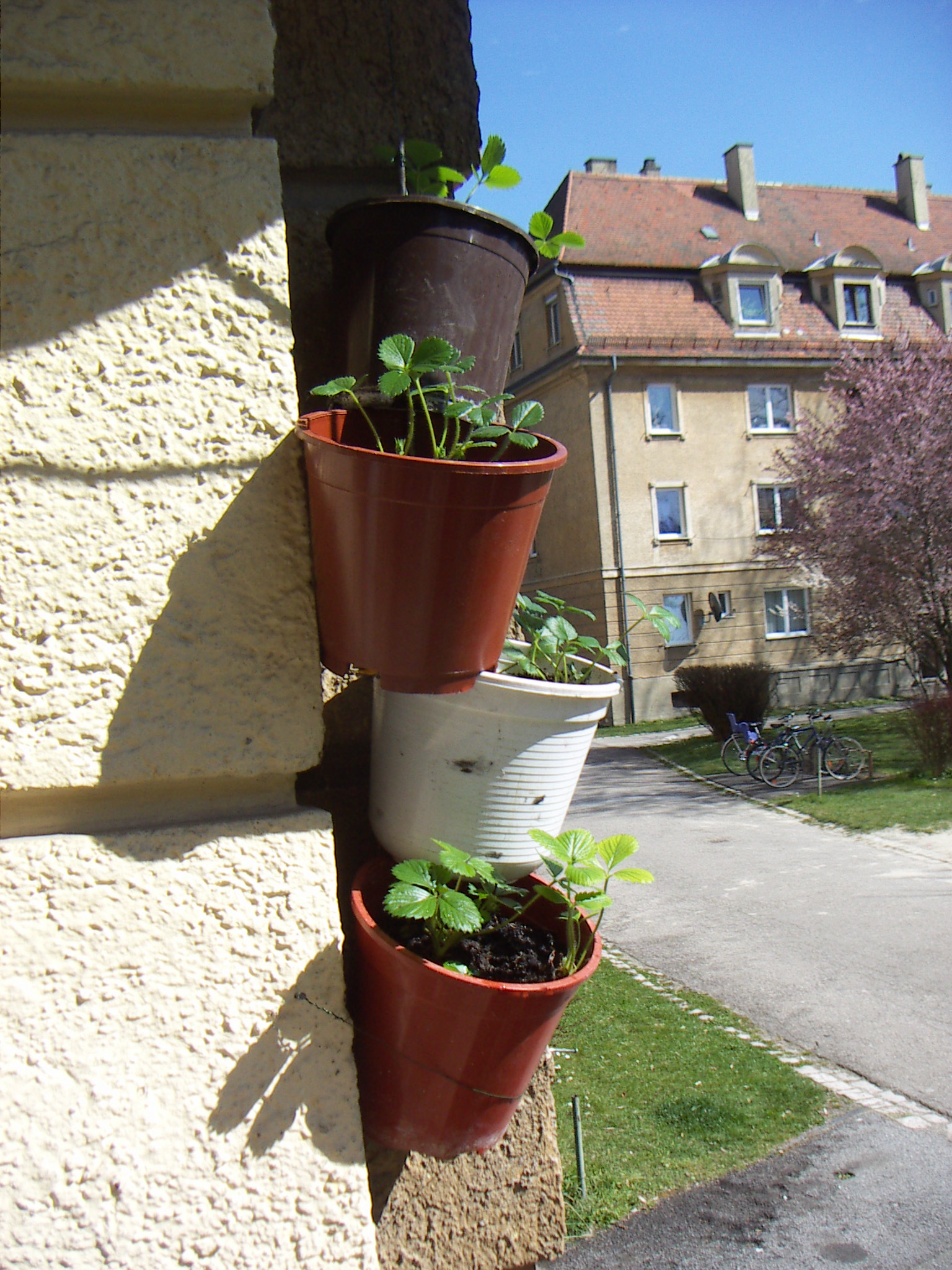 ich habe mir gestern 6 kleine erdbeer-pflänzchen geholt, die ich auf unserem balkon großziehen möchte. diese erdbeer-/kräuter-töpfe mit mehrern öffnungen finde ich ja ganz toll, weil platzsparend. allerdings sind sie mir dann doch etwas zu teuer.