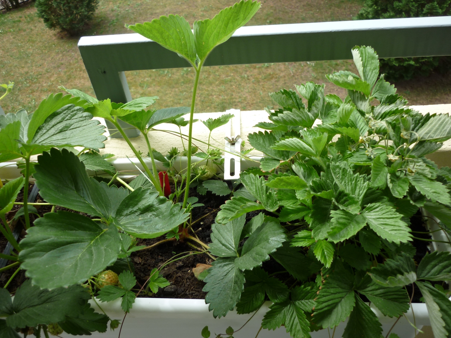 Ich hänge noch 2 Bilder an, eines ist eine Gesamtaufnahme im Balkonkasten (stehen die Erdbeeren bei mir zu dicht?) und das zweite eine Nahaufnahme eines befallenen Blattes.