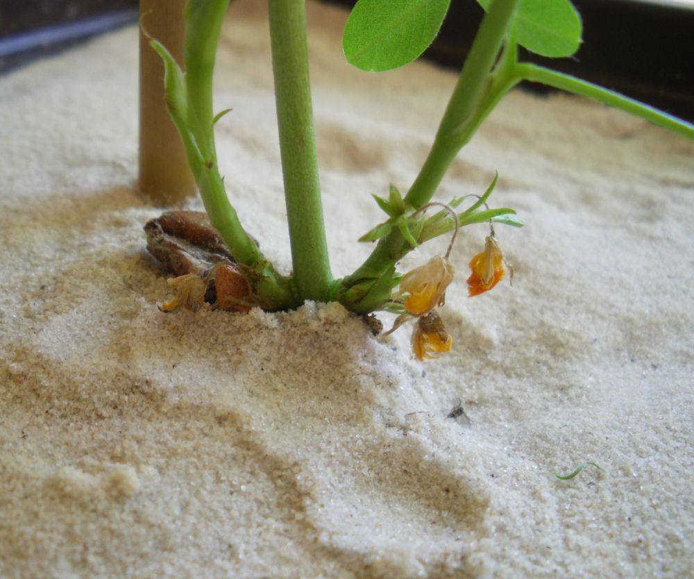Es senkt sich auch nicht die Blüte in die Erde (wie leider oft fälschlich beschrieben), sondern unterhalb der vertrockneten Blüte entsteht so eine Art Stelzwurzel, die in der Erde verschwindet und dort die Erdnüsse bildet...