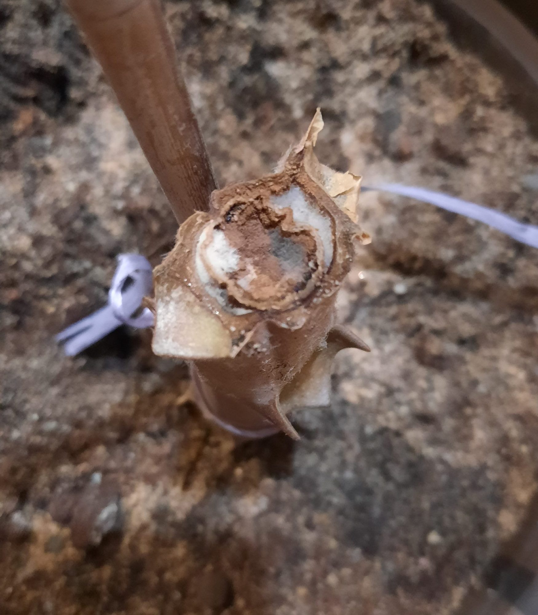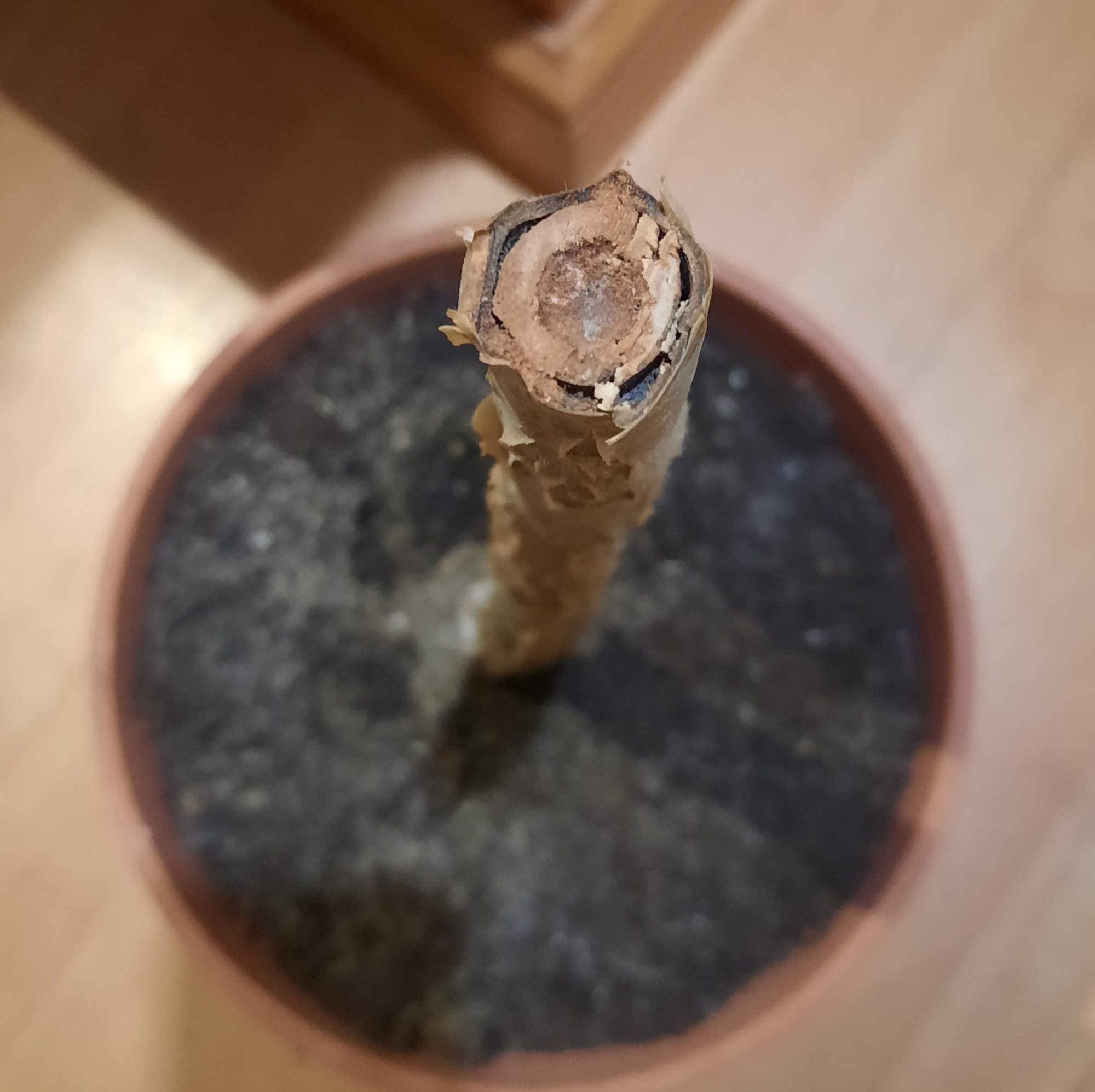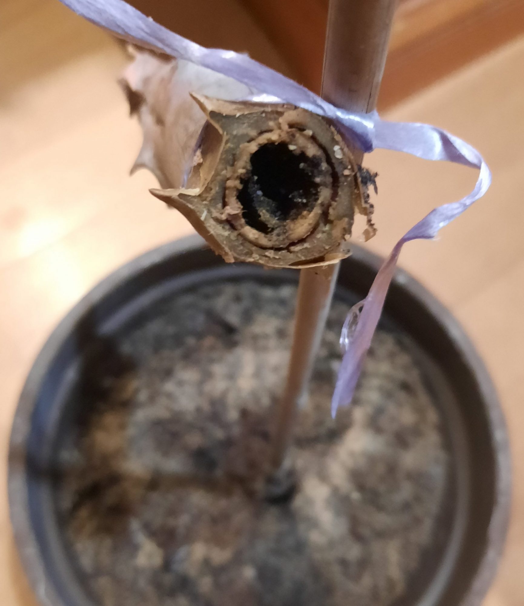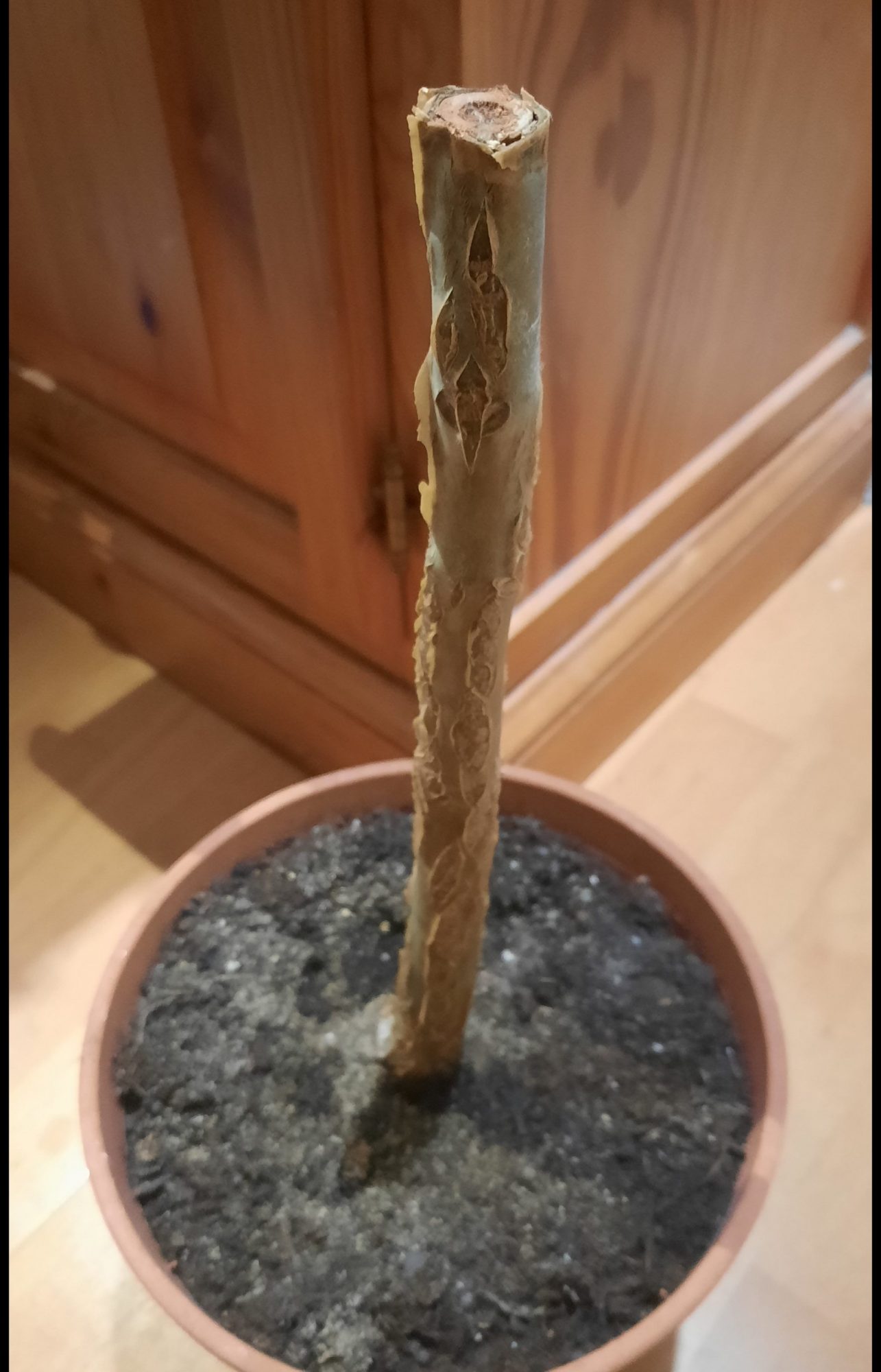 Ich habe den Mutterstamm bis 25 cm über der Erde abgeschnitten, welcher aber keine Blätter mehr besitzt. Zusätzlich habe ich ein größeres Blatt, die kleine Spitze und ein größeren Stammteil als Stecklinge in Erde gesteckt und ein bisschen gegossen. Das Blatt und die Spitze scheinen keine Wurzeln zu bilden und der Stammsteckling ist im unteren Teil weich geworden. Der Mutterstamm ist bisher unverändert und hat noch keine neuen Triebe entwickelt.