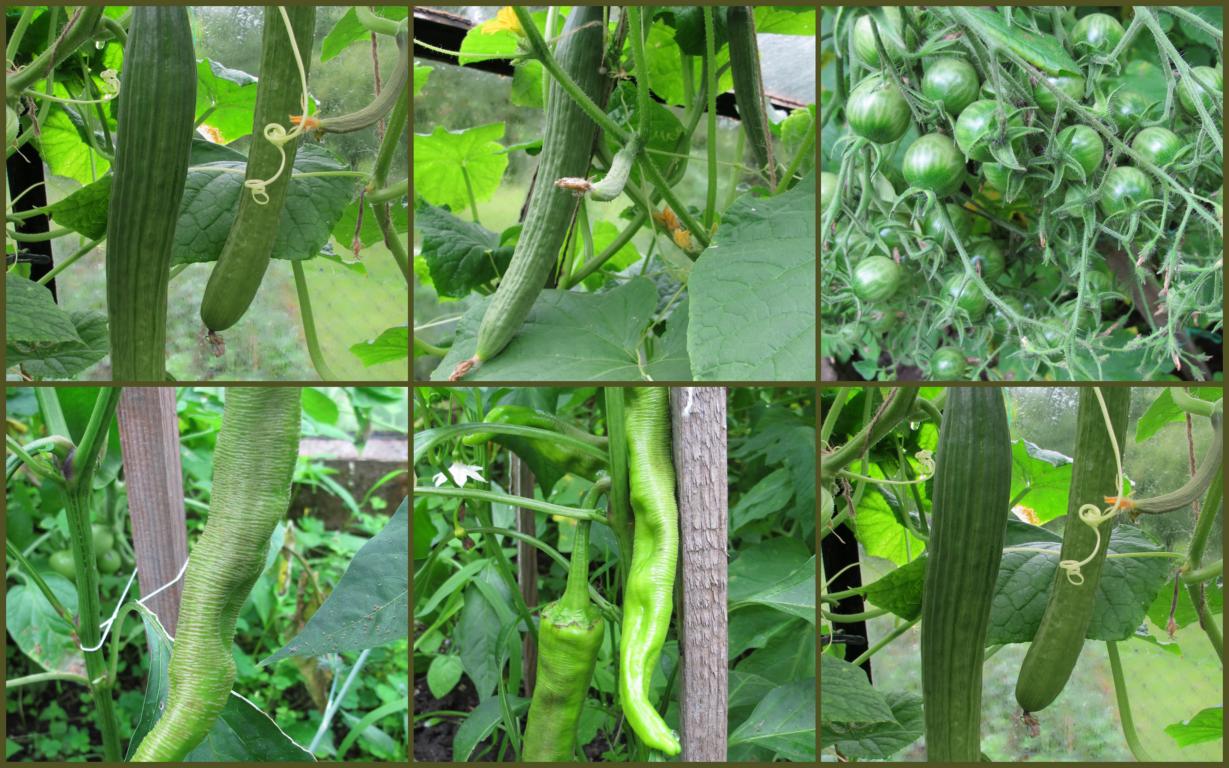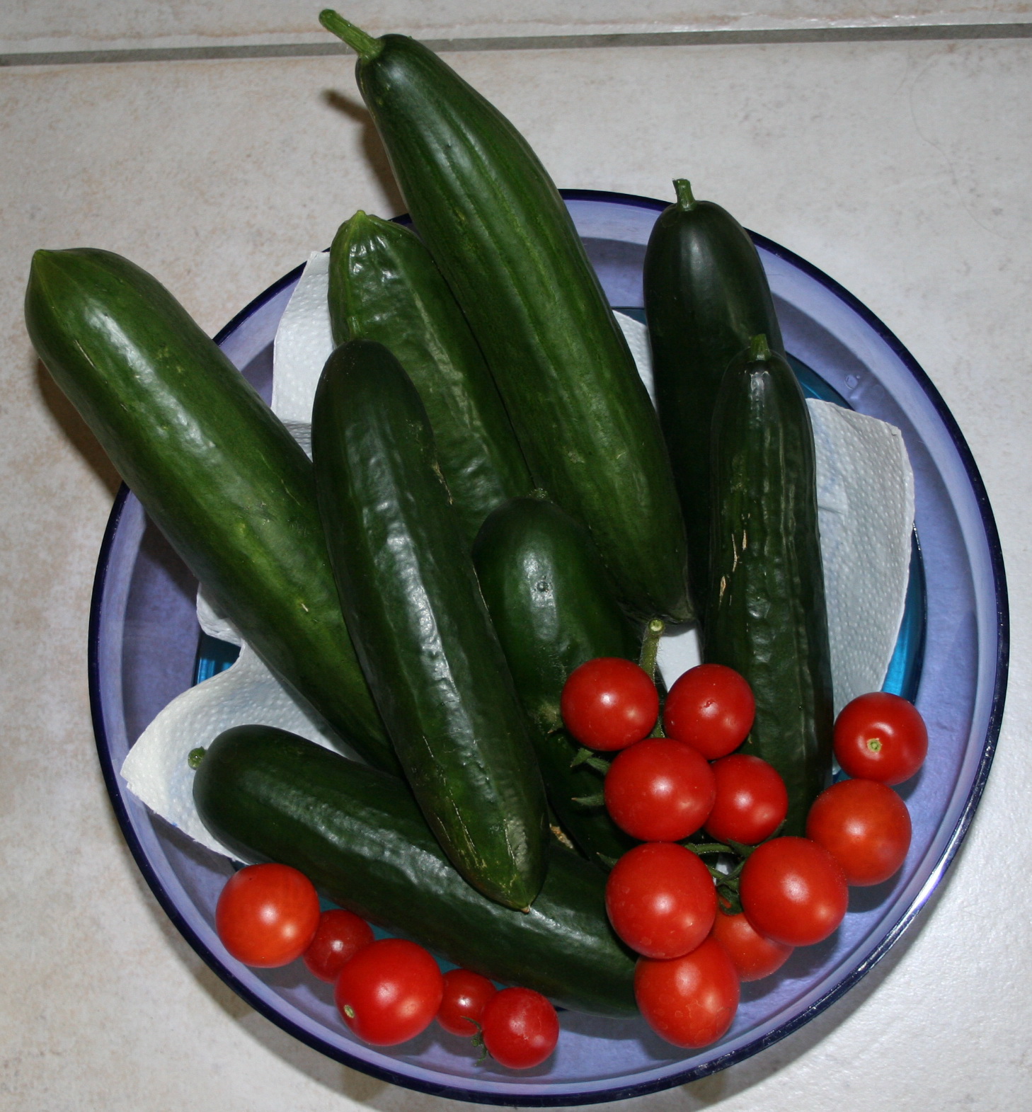 Super Ernte, Anke. Ein paar reife Tomaten hatte ich auch schon und natürlich viele Gurken. Aber weil die letzten Nächte so kalt waren, wachsen die Gurken nicht so üppig. gemüse1.JPG (174.11 KB) gemüse1.JPG