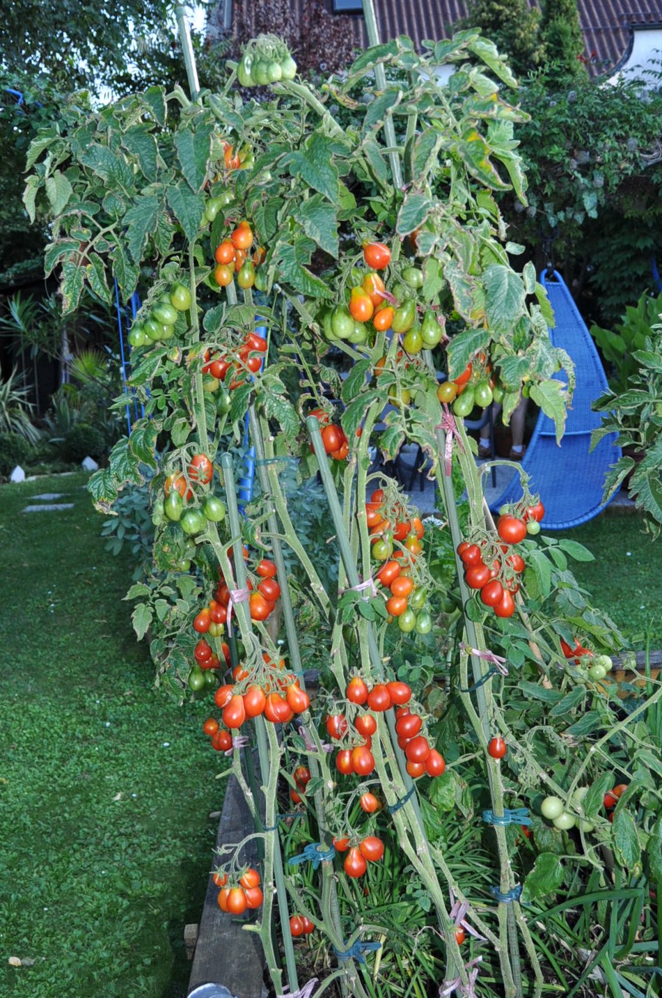 In dem großen Tomatenbeet sind nur 5 große Stauden drin ... in meinen 2 kleinen Beeten sind 4 Tomaten und im anderen 6 Paprikastauden ... den Rest hab ich auf den Garten verteilt ... Tomaten- und Paprika- und Chilistauden wetteifern um die schönsten Blüten mit meinen ganzen anderen Pflanzen