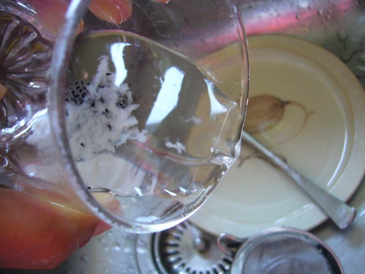 Die Fruchtfleisch-Samen-Pampe in ein Glas füllen, nicht zu viel auf einmal. Mit Wasser auffüllen und ordentlich rühren. Etwas warten, bis die Samen abgesunken sind. Das Fruchtfleisch lässt sich ganz gut abschütten - immer wieder auffüllen. Evtl. geht's in einem unten schmalen, oben großem Glas (Sektglas oder so was) besser. Am Ende die Samen wieder in's Sieb schütten (und Frühstarter, die nicht warten wollten, bis das ganze Fruchtfleisch weg is, natürlich genau so ), nochmal gut waschen. Samen auf ein Küchentuch schütten, verteilen und ab in die Sonne zum Trocknen. Die Samen kleben ziemlich fest, lassen sich aber, wenn sie groß genug sind, mit dem Fingernagel gut abkratzen. In ein Tütchen füllen, sobald sie RICHTIG trocken sind - im Zweifel lieber in einem offenen Plastikbecher oä. noch ein, zwei Tage zwischenlagern.