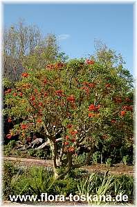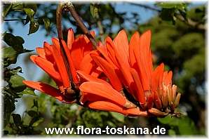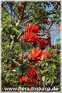 Dieser in Südafrika -Kafferboom- genannte Korallenstrauch (Erythrina caffra) ist ein strauchiger bis baumförmiger Vertreter seiner illustren Familie. Die Blütenstände ordnen sich noch vor oder während des neuen Laubaustriebs im Frühling/Frühsommer in attraktiven wie auffälligen Quirlen an den Triebenden an. Die einzelnen Blüten sind orangerot und haben den hierzulande sommergrünen Kraftpaketen mit den im Alter knorrigen Stämmen im US-Bundesstaat Kalifornien eine so weite Verbreitung eingetragen, dass der Kafferboom Stadtbaum von Los Angeles ist.