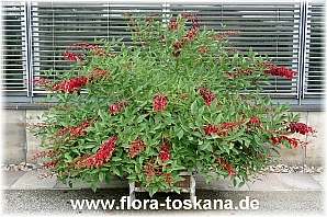 Pflanze: Laubabwerfender, bis 300 cm hoher Strauch mit prächtigen, korallenroten Blüten im Hochsommer und Herbst.