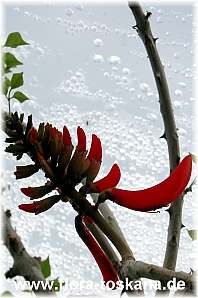 Als südamerikanischer Vertreter seiner Familie, überzeugt dieser Korallenstrauch (Erythrina falcata) im Sommer mit leuchtend roten Blütenständen, die weithin sichtbar sind. Die Blätter sind dreifiedrig, bewehrt und von einem hierzulande eher hellen Grün. Wie alle Korallensträucher schätzt auch dieser Strauch oder kleine Baum sehr lichtreiche, vollsonnige, aber nicht zu Hitze neigende Plätze, an denen ein steter Luftzug für leichte Kühlung sorgt. Obwohl Korallensträucher aus Regionen mit ausgeprägten Trockenzeiten stammen, sollte man sie während der Vegetationszeit sehr konstant mit Wasser und Dünger versorgen. Die heimatliche Trockenzeit ersetzen hierzulande die Wintermonate, in denen der Wasserbedarf der laublosen Pflanzen stark, aber nicht auf Null sinkt: Die Wurzeln benötigen in Topfkultur auch in der kühlen Jahreszeit eine leichte Grundfeuchtigkeit.