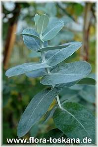 Schnitt: Eukalyptus hat die natürliche Tendenz, baumförmig zu wachsen. Nur durch regelmäßigen Schnitt im Frühjahr können die Pflanzen kompakt gehalten werden. Starker Rück-schnitt bewirkt bei verkahlten Pflanzen einen raschen, buschigen Neuaustrieb.