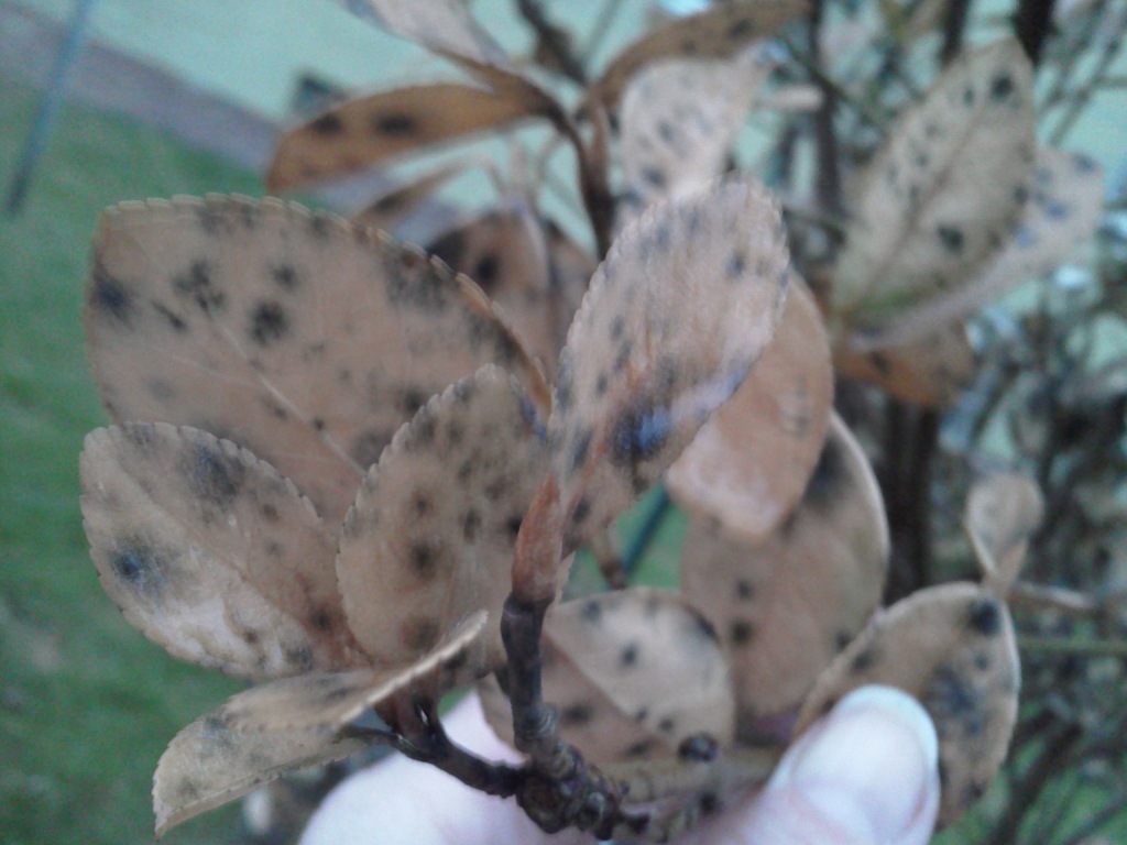 Alle Blätter weisen diese komischen Punkte auf. Er bekommt aber auch schon zaghaft neue Knospen.