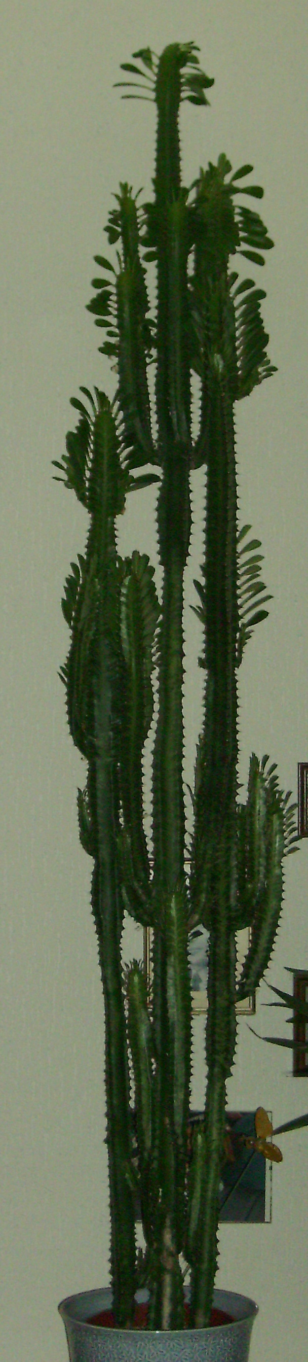 Meine Euphorbia ist mittlerweile fast 250 cm hoch. Seit einem Jahr steht sie nach meinem Umzug im Wintergarten und hat sich in den Spitzen stark verzweigt. Jetzt kippen natürlich die Stämmchen, denn die Köpfe sind viel zu schwer.