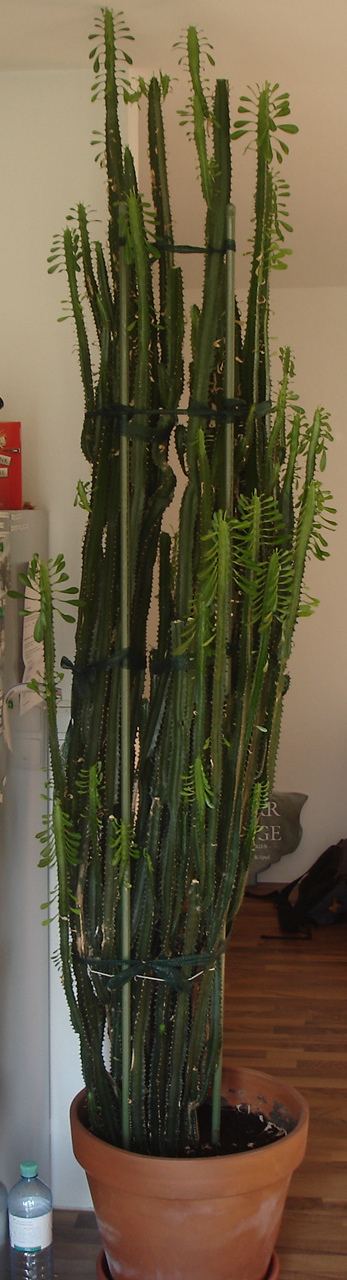 Dann hab ich sie mit nach Hause genommen und alle zusammen in einen großen Topf gesetzt. Durchmesser ca. 60 cm. Dann einfach ganz normal gegossen. Die 3 sind jetzt im Topf schon ca. 180cm und haben ganz viele Seitenaustriebe bekommen. Da ich aber in nem Altbau wohne haben die 3 noch viel Platz nach oben