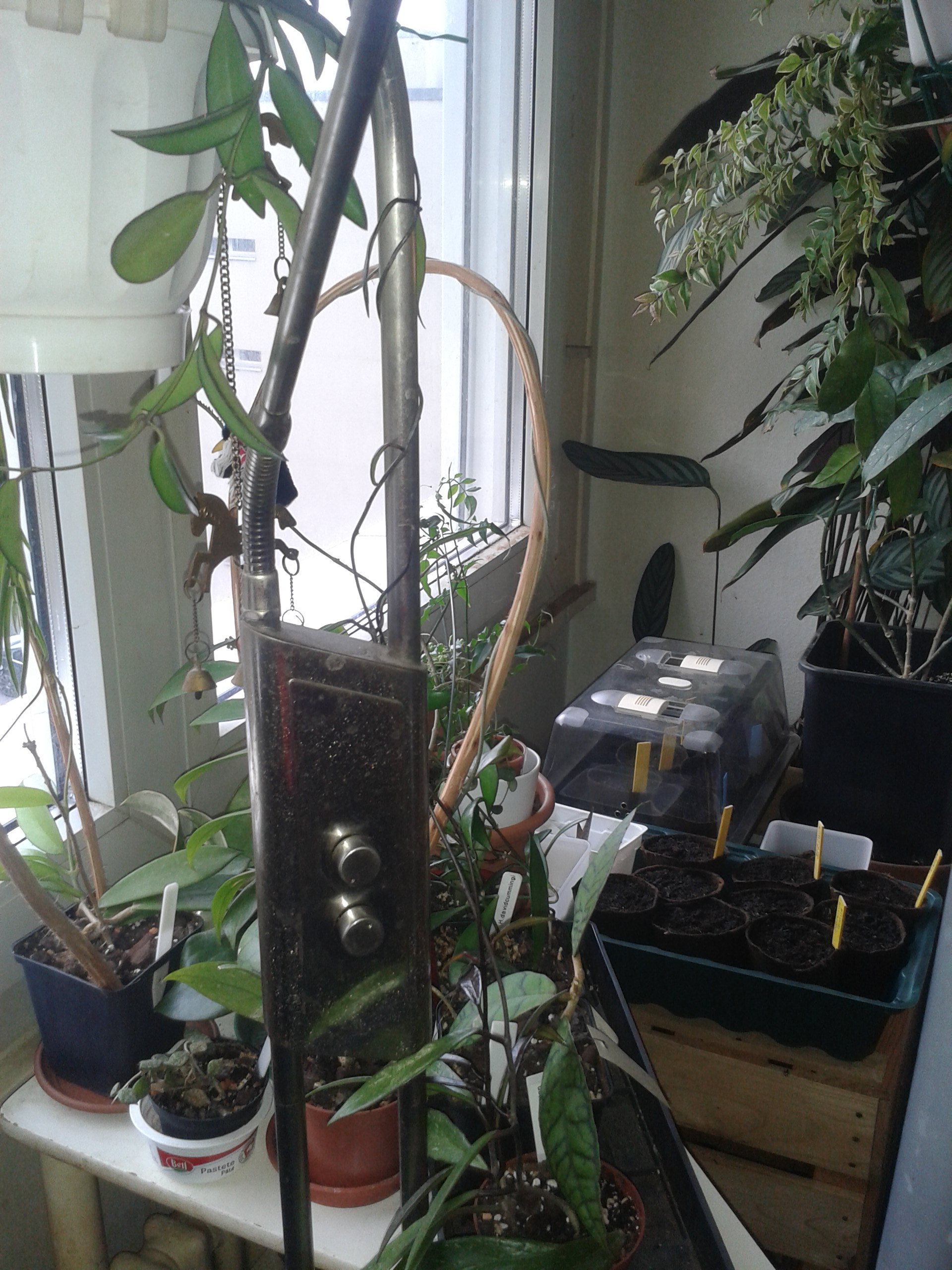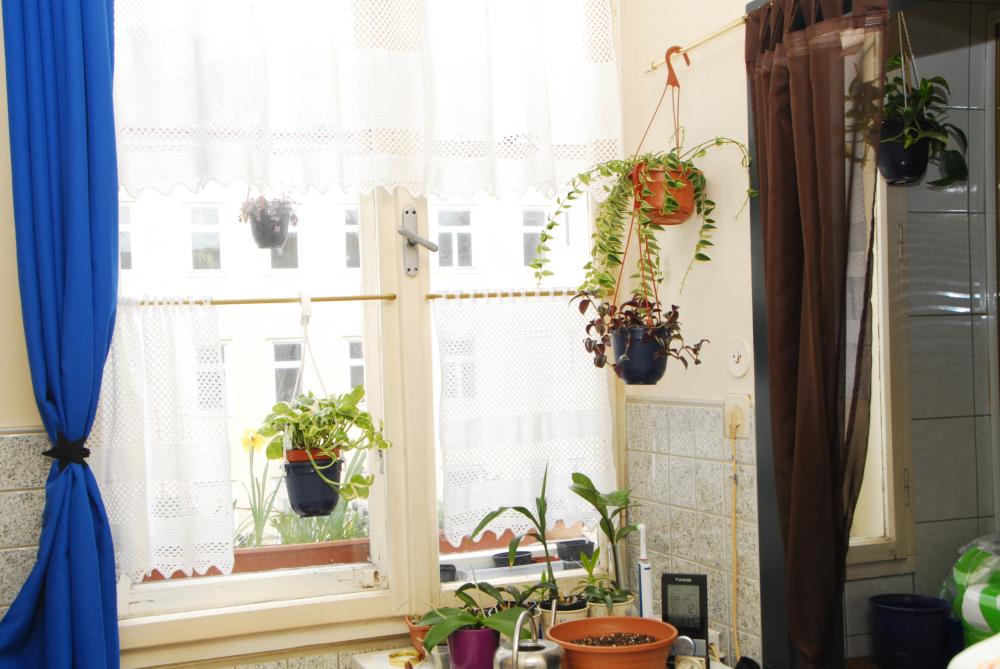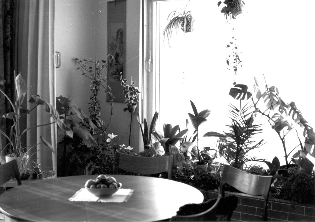 Es handelt sich in der Tat um das gleiche Fenster, nämlich um das Blumenfenster meiner Mutter. 1963 ist natürlich schwarz-weiß. Da sind einige Pflanzen, an die ich mich aus Kinderzeiten noch erinnere. Das ist rechts mal der Baumfreund (oder ist es ein Fensterblatt? Wir haben immer Philodendron dazu gesagt). Die kleine Palme kriegte nach einiger Zeit die rote Spinne, und meine Mutter hat sie weggeworfen. Der letzte Ableger vom Gummibaum, der dann kommt, ist letzten Winter kaputt gegangen (großes Loch im Stamm). Dann kommt die Clivie; meine ist ein Kindel x. Generation davon, auch die, die auf dem heutigen Bild zu sehen ist, ist ein Kindel x. Generation davon. Den Bogenhanf gibt's schon lang nicht mehr, der ist wohl relativ schnell kaputt gewesen. An den hab ich keine Erinnerung. Das gleiche gilt für die Pflanzen rechts davon. Dafür hatte meine Mutter damals noch keine Yucca, und das Blumenfenster wurde auch noch nicht als Winterquartier für die Geranien verwendet. Aber oben hängt auch dort schon eine Grünlilie; meine ist auch ein Kindel x. Generation von der, ebgenso wie die, die auf dem aktuellen Foto rechts unten zu sehen ist. Übrigens die kleine Yucca halblinks hatte meine Mutter wegwerfen wollen. Die war am Gangfenster gestanden und hatte jede Menge Schildläuse gehabt, worauf meine Mutter sie stark abgeschnitten hatte. Und dann wollte sie sie weg tun, aber man sieht ja, wie schön sie wieder treibt.