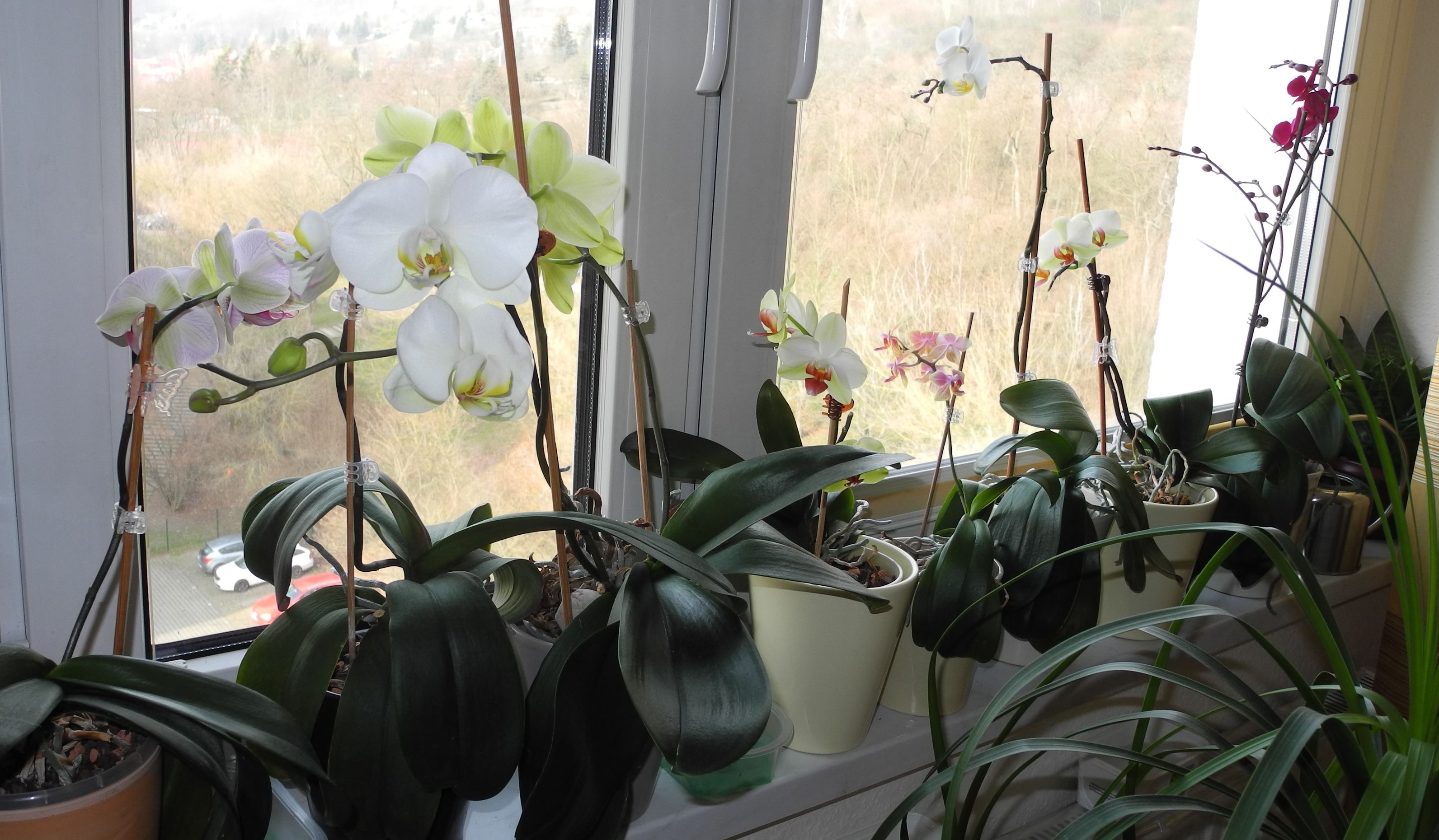 So dann zeige ich euch doch mal meine Fensterbänke! Tja was soll ich sagen im Wohnzimmer hätte ich so ein schönes langes Fensterbrett wo meine Orchideen so toll ein passen würden. Aber leider habe ich auch 3 Raudi-Kater die dieses Fensterbrett für sich beansprucht haben und jeder Topf der dort stehen würde würde eliminiert werden!