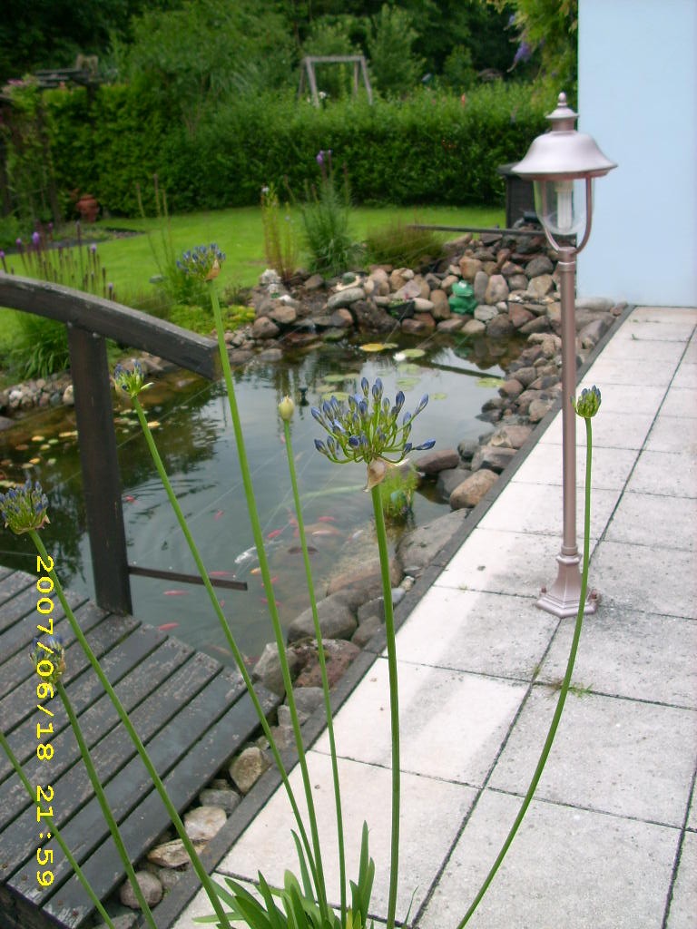 Man muss dazu sagen, dass mein Vater in 4 Wochen 70 Jahre alt wird und die gesamte Anlage des Teiches ausschließlich selbst errichtet hat - vom Ausschachten, über Begrenzungsmauer ziehen und Wasserfall konstruieren, bis zum Bepflanzen - also von vorne bis hinten das Werk EINES Mannes. Er ist sehr stolz auf seinen Teich und das kann er auch sein, finde ich. Da die Bepflanzung erst im Frühsommer erfolgte, sieht es noch ein wenig kahl aus und was bereits geblüht hat, ist nun verblüht. Nächstes Jahr sieht das bestimmt schon alles dicht und komplett begrünt aus.
