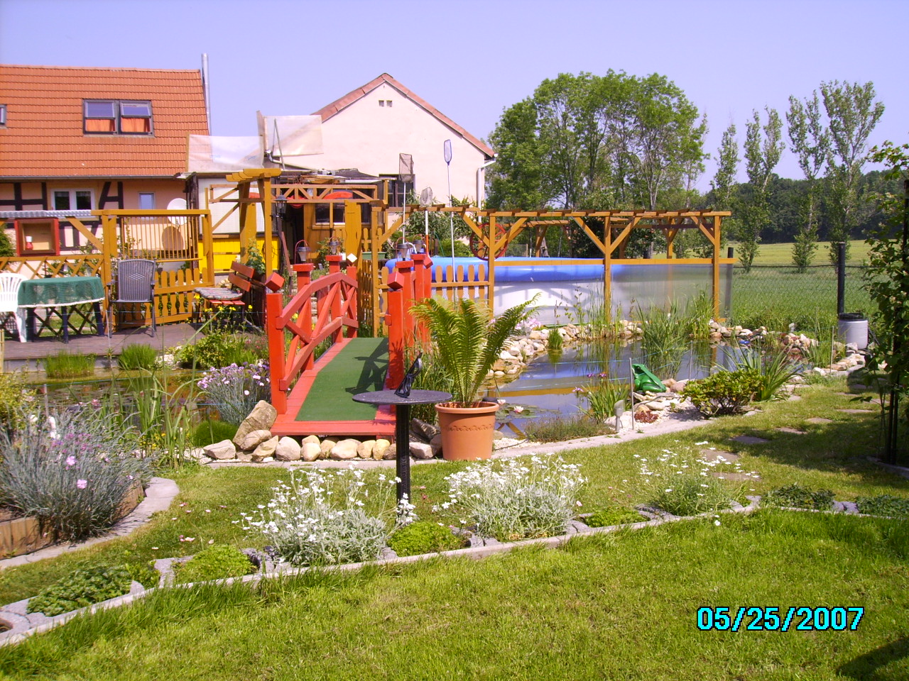 Der Zaun rund um den Teich soll unsere Kinder vor Fehltritten schützen. Erst hatte ich gedacht, daß diese Sicherungseinrichtung das Bild "verschandelt", aber im Nachhinein gefällt es mir mit dem Zaun sehr gut.
