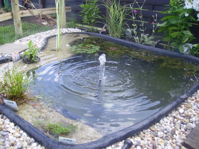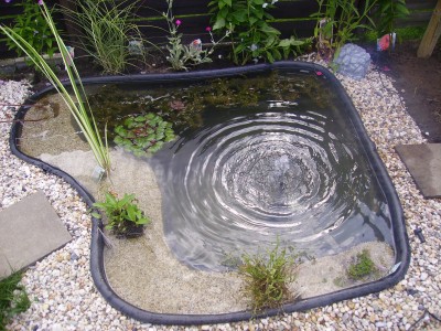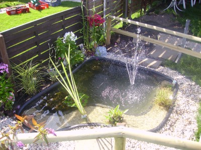 Der Teich besteht aus einer Fertigschale mit einem Volumen von ca. 454l und ist ca. 1,60m x 1,40m bei 53cm Tiefe.