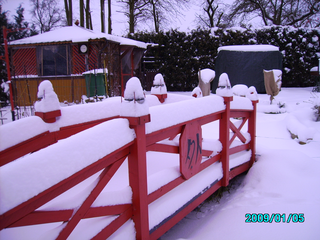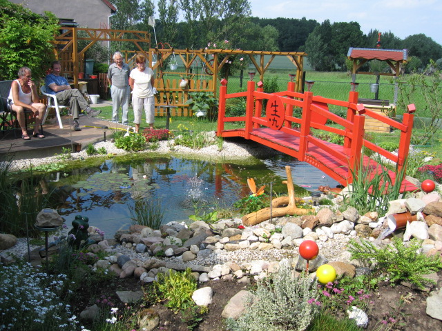 Der Zaun rund um den Teich soll unsere Kinder vor Fehltritten schützen. Erst hatte ich gedacht, daß diese Sicherungseinrichtung das Bild "verschandelt", aber im Nachhinein gefällt es mir mit dem Zaun sehr gut.