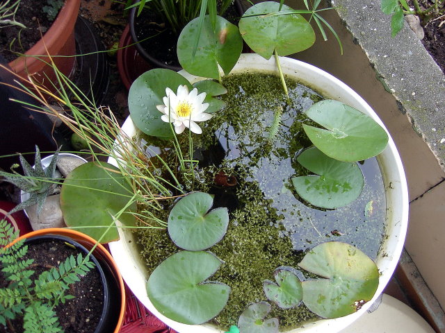 Er ist jetzt zwei Jahre alt und in ihm wohnen ein paar grüne Frösche, ca. 20 Koi, 3 Blauorfen, 1 Grünschleie, 3 Goldfische, 4 Shubunkis und Goldfisch-Shubunki Nachwuchs (Anzahl unbekannt). Durch den hohen Fischbesatz haben wir leider fast den ganzen Sommer über trübes Wasser, trotz Filteranlage.