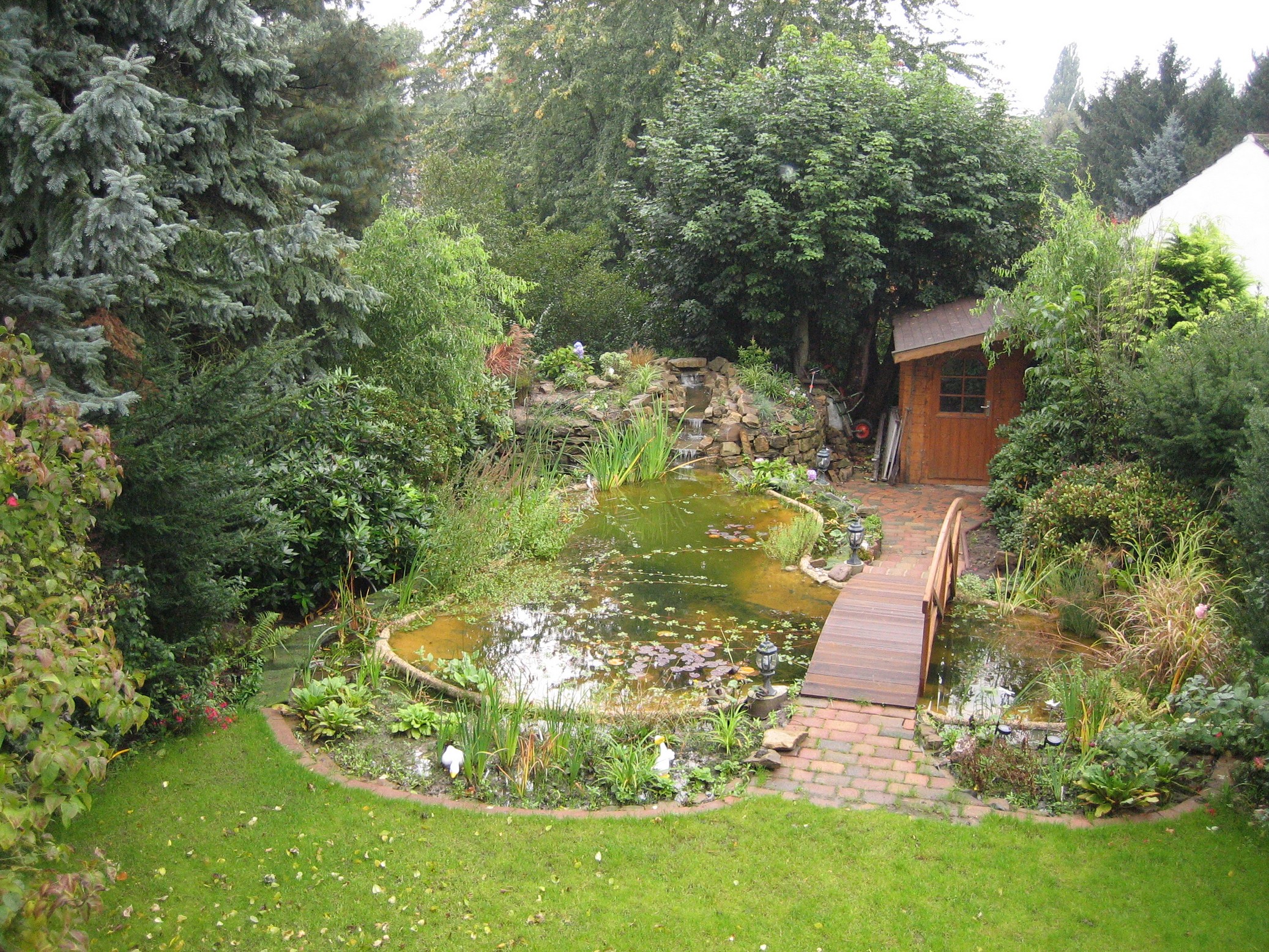 Man muss dazu sagen, dass mein Vater in 4 Wochen 70 Jahre alt wird und die gesamte Anlage des Teiches ausschließlich selbst errichtet hat - vom Ausschachten, über Begrenzungsmauer ziehen und Wasserfall konstruieren, bis zum Bepflanzen - also von vorne bis hinten das Werk EINES Mannes. Er ist sehr stolz auf seinen Teich und das kann er auch sein, finde ich. Da die Bepflanzung erst im Frühsommer erfolgte, sieht es noch ein wenig kahl aus und was bereits geblüht hat, ist nun verblüht. Nächstes Jahr sieht das bestimmt schon alles dicht und komplett begrünt aus.