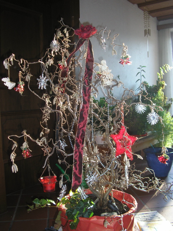 Aber ich zeige euch mal was ich für Mama bei meiner Oma gebastelt habe; Eine Korkenzieher- Weihnachtshasel! (Korkenzieher- Haseln haben lockenartig eingedrehte Äste und wachsen sehr langsam bot: Corylus avellana „Contorta“)