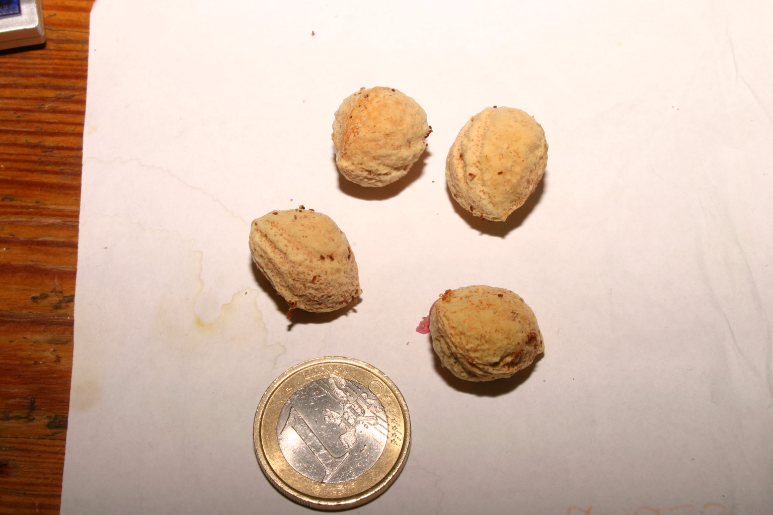 habe mal wieder Samen aus einem Urlaub in BCN eingepflanzt und heraus kam dieses Bäumchen. Um die Samen (wie kleine Pfirsich- oder Nektarinensteine) war eine (ziemlich dünne) fleischige Fruchthülle, die aromatisch roch, aber leider von Dörrobstmotten komplett aufgefressen wurde, daher kann ich nicht die komplette Frucht zeigen.
