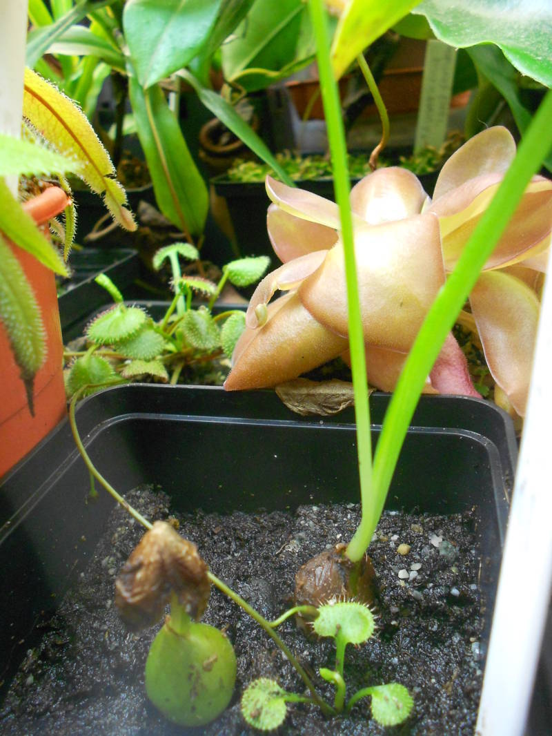 Weiß zwar gar nicht mehr genau, in welches Substrat ist sie genau gesetzt habe (auf jeden Fall war ein großer Teil Kakteenerde dabei, ich glaube mit nem kleinen Teil Blumenerde), aber die stehen "relativ" trocken, da sie nur einmal täglich besprüht (stehen ja im Terra bei den Nepenthes) werden. Selten bekommen sie auch mal einen extra Sprühstoß aufs Substrat.