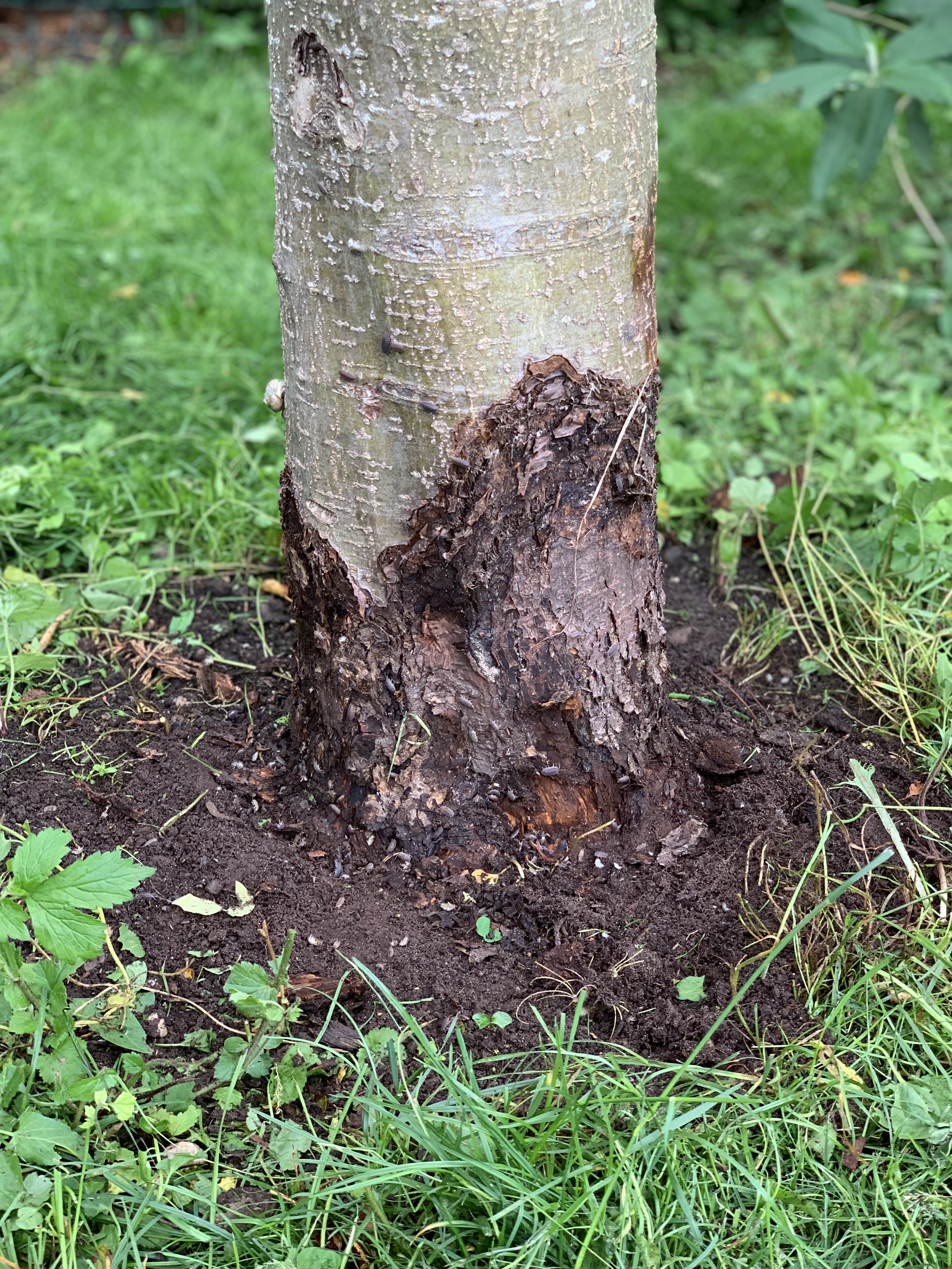 Mein über die Jahre hinweg gesunder, noch „junger“ Apfelbaum (9 Jahre) zeigt dieses Jahr einen gefährlichen Befall am Stammbeginn. Rundum fault die Rinde und sie wurde schon bewohnt von Kellerasseln. Ich habe nun das Unkraut darum entfernt um die Feuchtigkeit zu reduzieren und mit Brennesselsud die letzen Wochen behandelt, aber es ändert sich nichts. Im Gegenteil scheint die Krankheit schnell nach oben zu wandern.