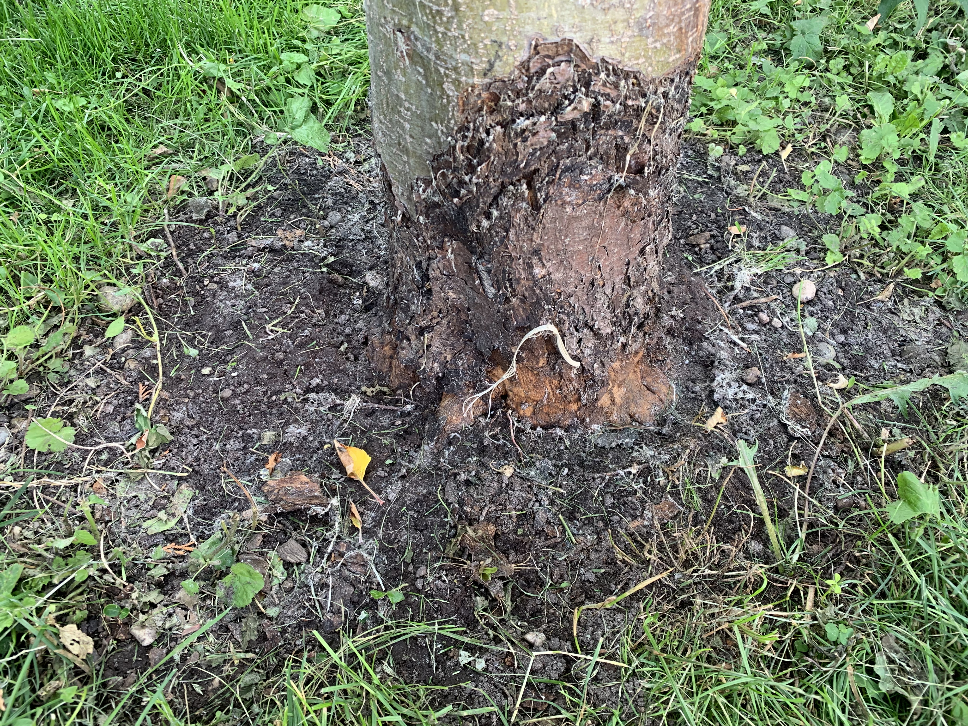 Also die "Fäulnis" ist nun weg. Offensichtlich war der Baum einfach durch das Unkraut dass dort stand (seit Winter) in einem feuchten Microklima. Auch die Asseln sind ausgezogen und damit ist die Vermulchung der Rinde schonmal gestoppt. Leider zieht sich der Schaden praktisch um den Baum herum. Anbei noch eines der gwünschten Bilder mit Wurzelausläufern, die auch "kahl" sind.