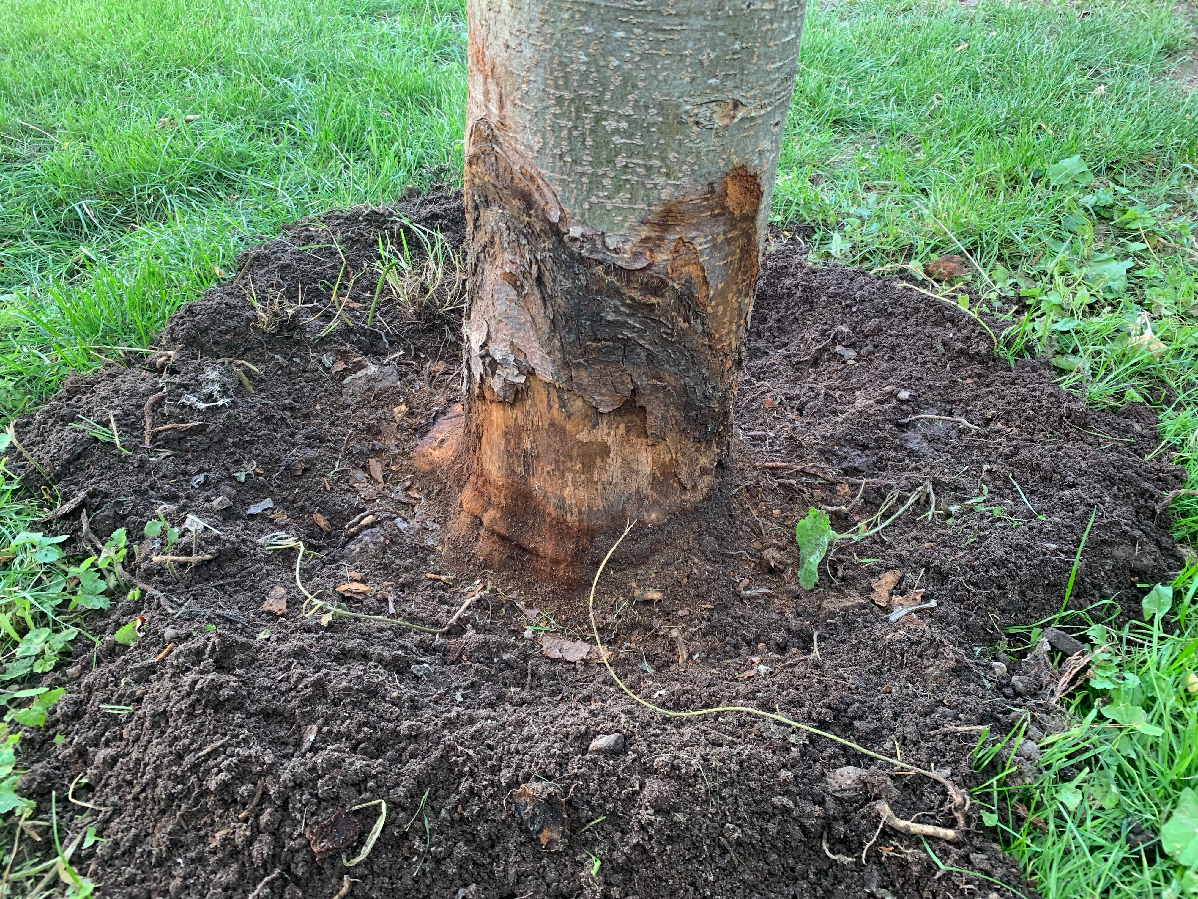 Das sieht wirklich nicht schön aus. Was ich auf dem Foto vermisse, ist ein sichtbarer Wurzelansatz. Der Stamm scheint fadengerade im Erdreich zu verschwinden. Wurde das Bäumchen vielleicht zu tief gepflanzt? Der Fuss eines Baumes sieht ja natürlicherweise so in der Art aus: https://img.geocaching.com/cac…c6e9f6.jpg